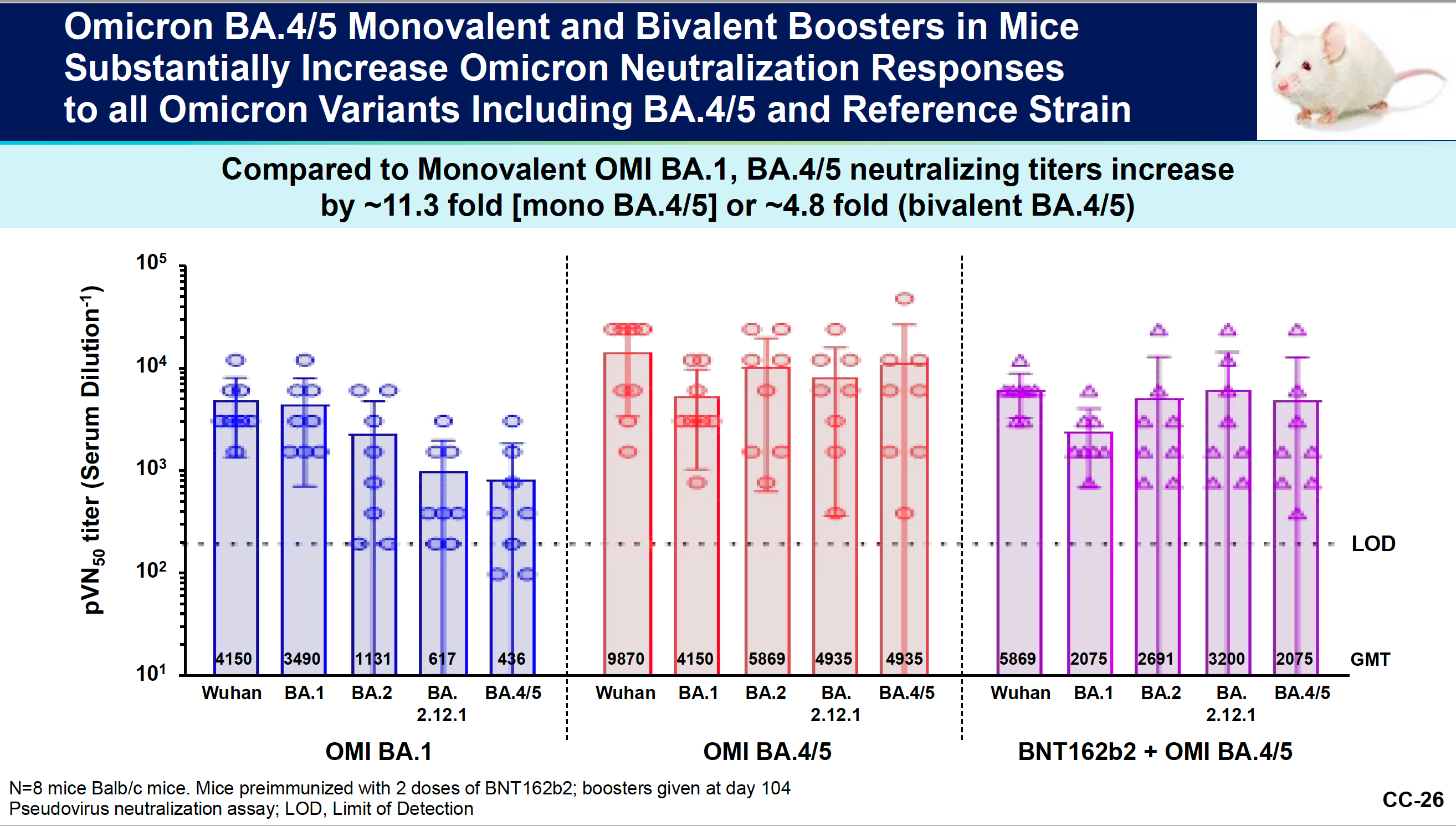 At this point, however, there are no data for a BA.5 booster in people. At the same FDA June meeting mice data were presented. As shown below, you can see in a limited number of mice of one strain, who had been given 2 shots of the original vaccine previously, there was a solid BA.5 neutralizing antibody response which was 2-fold higher for the monovalent (OMI, BA.5 only) booster. That’s encouraging compared with the BA.1 shot, but it’s not the same as human data.