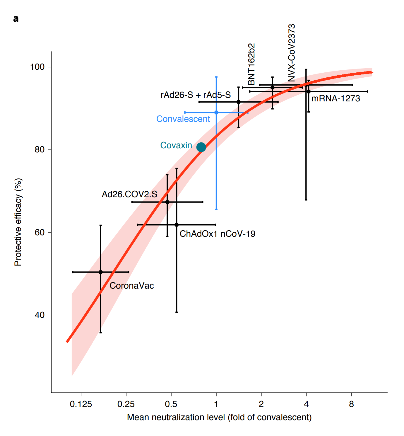 Our best surrogate marker (pre-Omicron) for efficacy is the level of neutralizing antibodies, from vaccines or infections, as has been established in multiple studies, correlating with protection from severe disease and symptomatic infections (as shown below). But with Omicron and its family of variants, the protection from infections and transmission has dropped substantially.