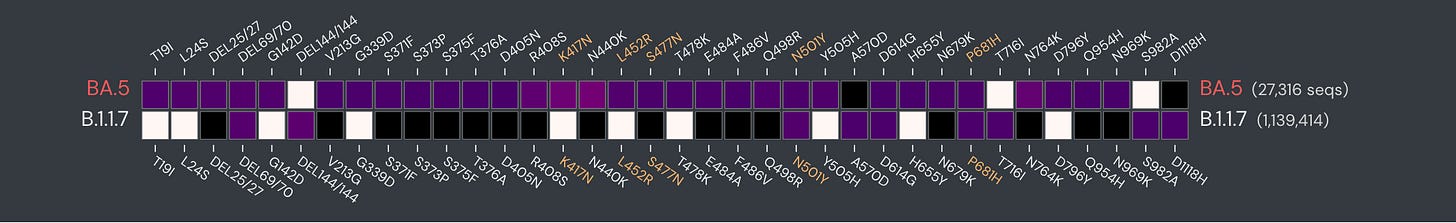 On the face of it, we’re long overdue for an updated Covid vaccine with the marked evolution of the virus since late in 2019. Just take a look at how the spike protein mutations for BA.5 are so dramatically different from the first major variant, Alpha (B.1.1.7).