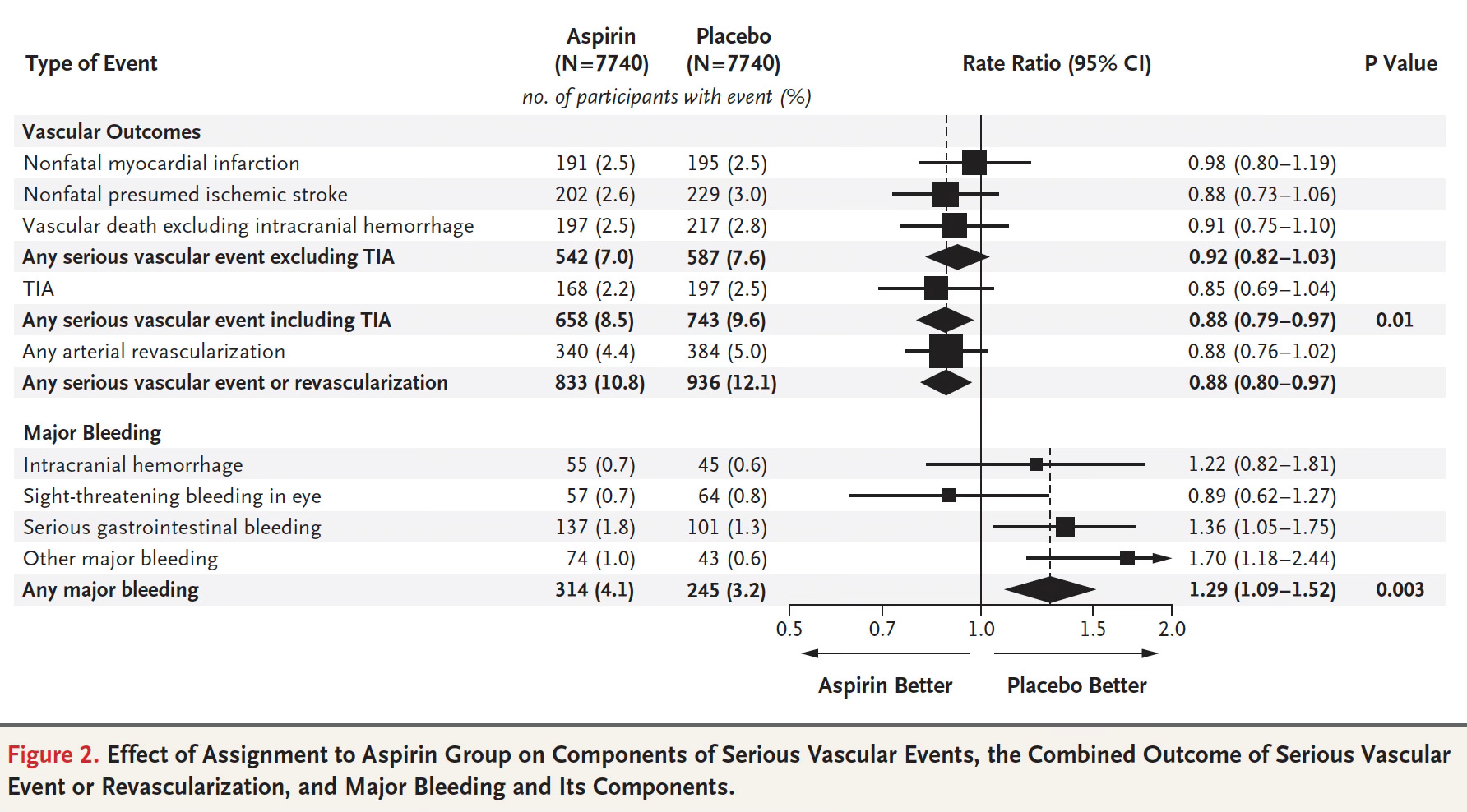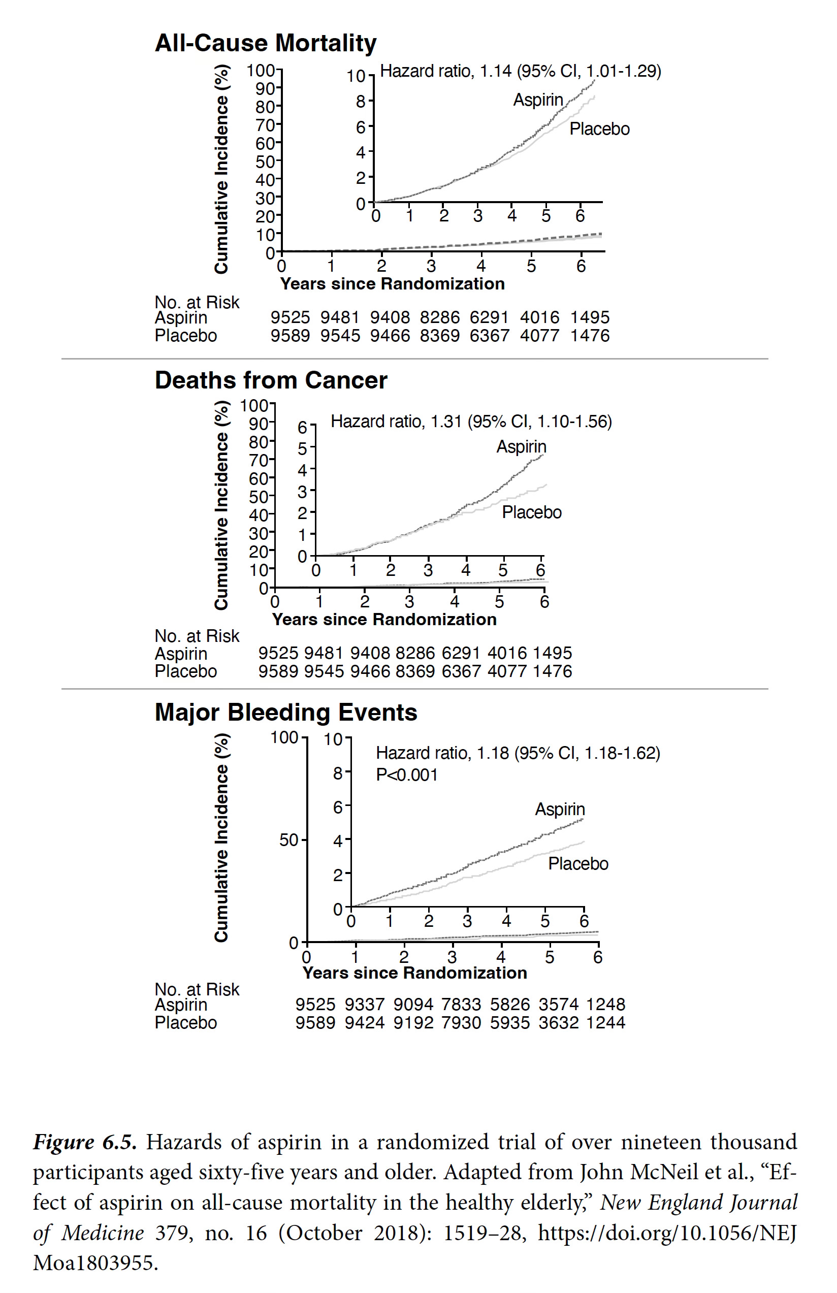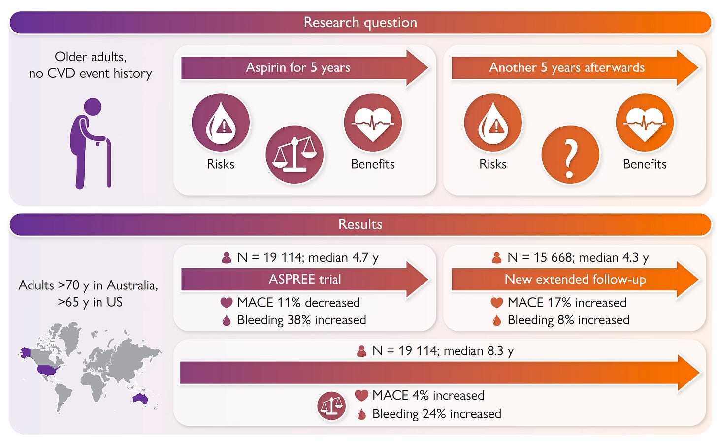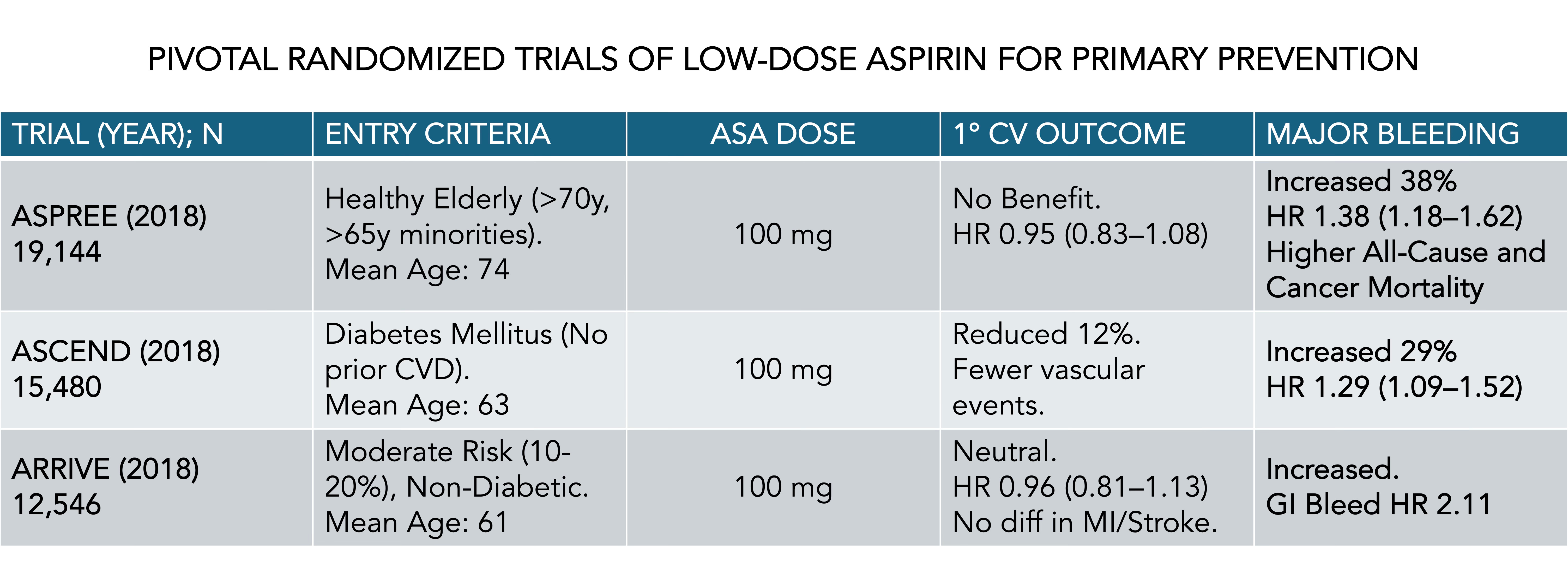ASPREE assessed aspirin in a healthy elderly population (mean age 74) of 19,114 participants from Australia and the United States. There were 1,052 deaths during nearly 5 years of follow-up, with a 14% higher rate of death for aspirin (all-cause mortality) mostly accounted for by increased cancer mortality (3.1% vs 2.3%, a 31% increased hazard ratio). There was no significant reduction of cardiovascular events for aspirin, which was dosed at 100 mg enteric-coated. Aspirin significantly increased major bleeding rates with rates of 8.6 events per 1,000 person-years in the aspirin group versus 6.2 per 1,000 person-years in the placebo group (HR, 1.38; P<0.001), a nearly 40% higher risk, primarily driven by gastrointestinal and intracranial bleeds.