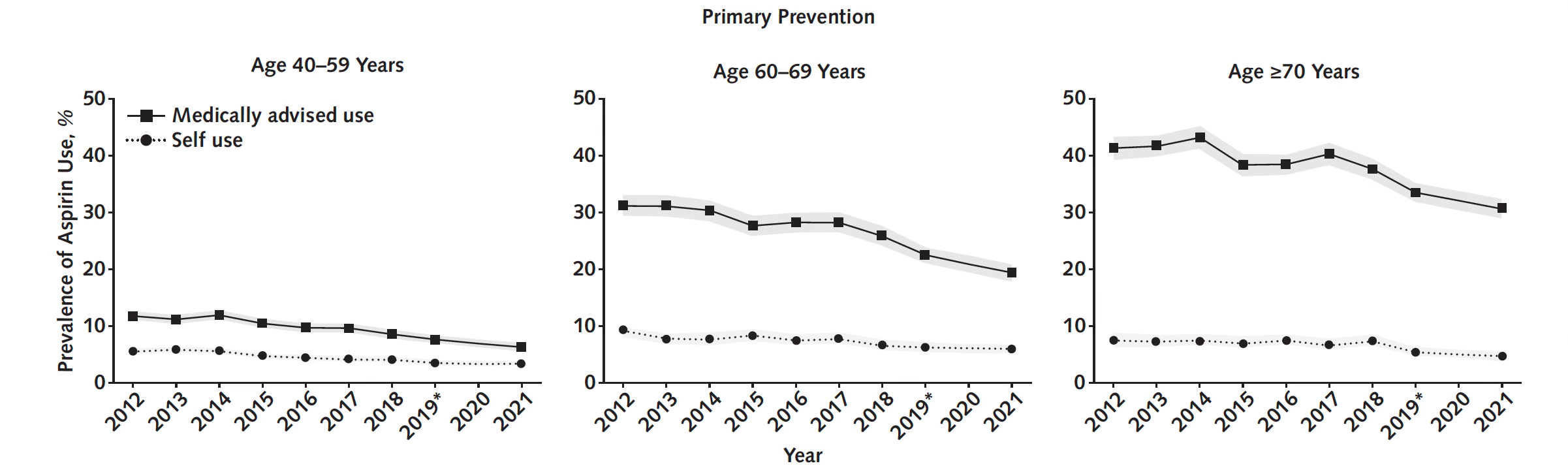 It’s hard to turn around a medical myth, exemplified by the notion that low-dose aspirin is safe and effective in healthy adults for primary prevention of heart disease, especially in people aged 60 years and older. In 2018, 3 pivotal, very large randomized trials were published, consistently showing the risk of major bleeding exceeded the benefit of CV event reduction. Even though it has now been >7 years since these trials were published, a substantial proportion of people of advanced age are still taking low-dose aspirin for primary prevention, mostly as advised by their physicians! In a survey of 160,000 Americans without heart disease, more than 30% of people age 70+ years were taking low-dose aspirin in 2021.