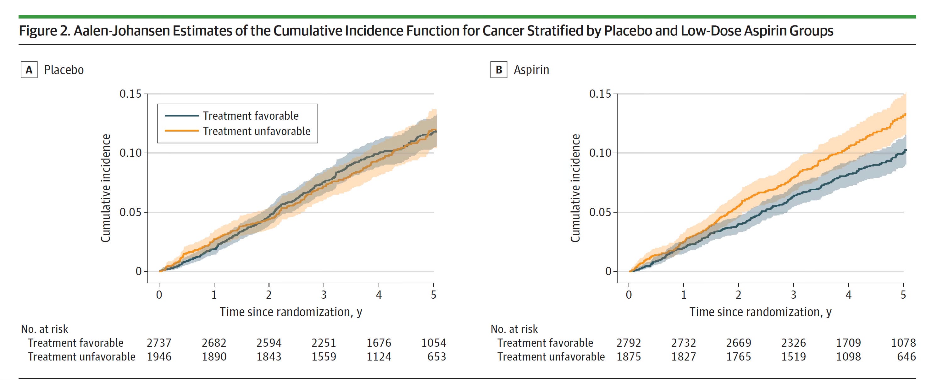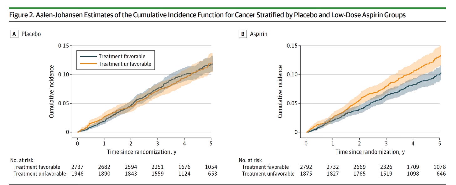 There has been a longstanding debate about whether low-dose aspirin should be used to prevent cancer, especially of the colon. in older adults. The ASPREE trial of healthy aged participants helped to understand the benefit of aspirin for primary prevention of cancer. Recall that the trial found higher cancer-related mortality, which is certainly not favorable. But best estimates showed 100 mg aspirin provided some modest protection from developing cancer (Figure).