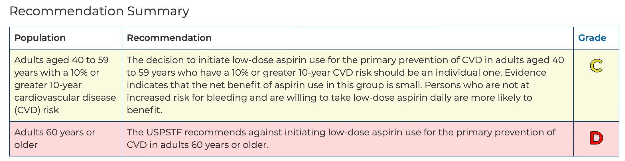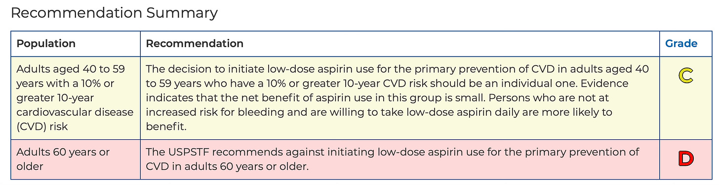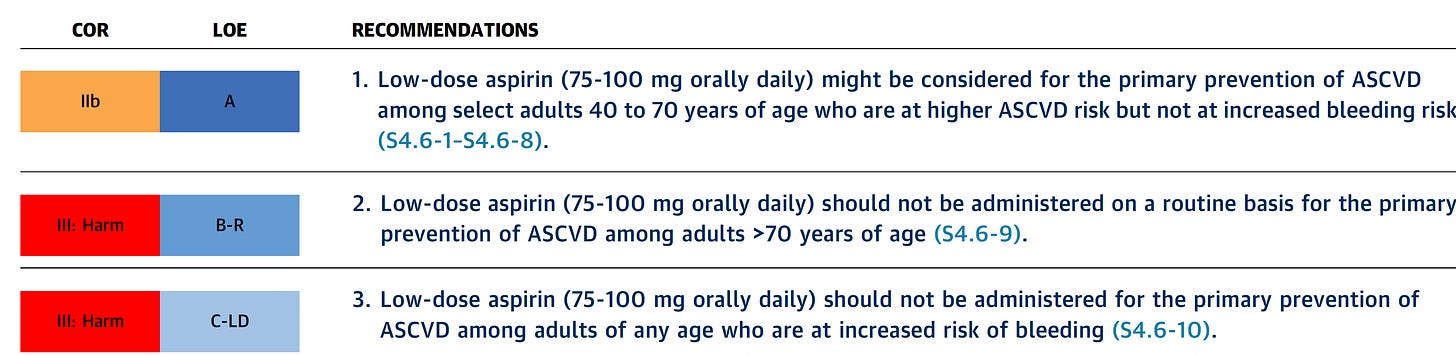 You can see the contraindication for use of low-dose aspirin by both guidelines, with a cutoff of age 70+ for ACC/AHA and age 60+ by USPSTF. The lower age for the latter was backed up extensively by updated modeling in 2022.