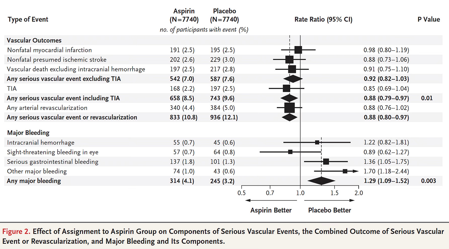 ASCEND was a primary prevention trial in people with diabetes, a key risk factor, but no evident cardiovascular disease. A total of 15,480 participants with mean age of 63 years were followed for 7.4 years. As shown below, the 12% reduction of vascular events was offset by a 29% excess of major bleeding events. The conclusion of the trial report was was follows: “The absolute lower rates of serious vascular events were of similar magnitude to the absolute higher rates of major bleeding, even among participants who had a high vascular risk.”