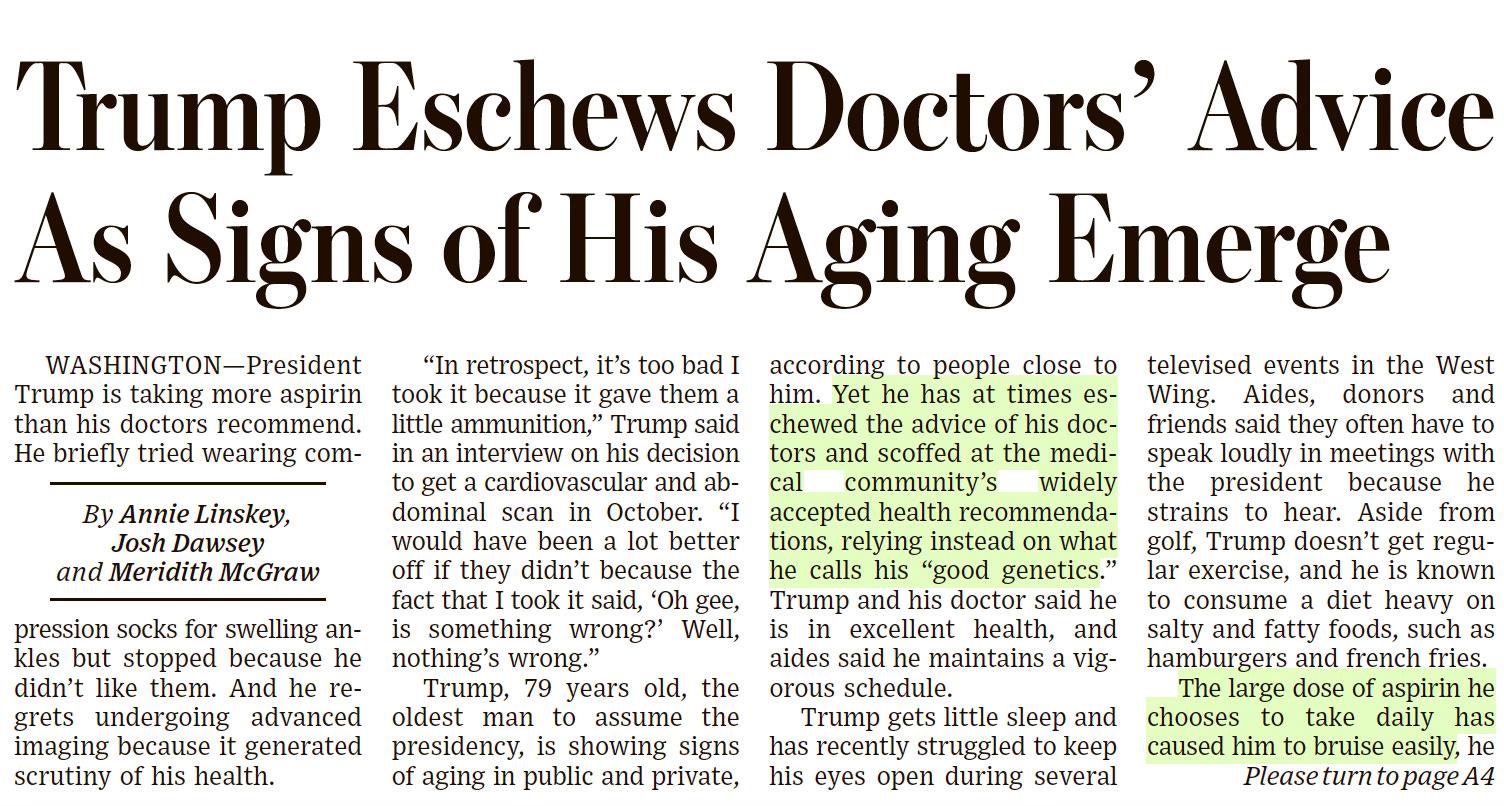 A lengthy interview with President Trump about his health was published in WSJ, reporting that his doctors advised taking 81 mg of aspirin to prevent heart disease but he takes 325 mg. He explained: “They say aspirin is good for thinning out the blood, and I don’t want thick blood pouring through my heart. I want nice, thin blood pouring through my heart. Does that make sense?”