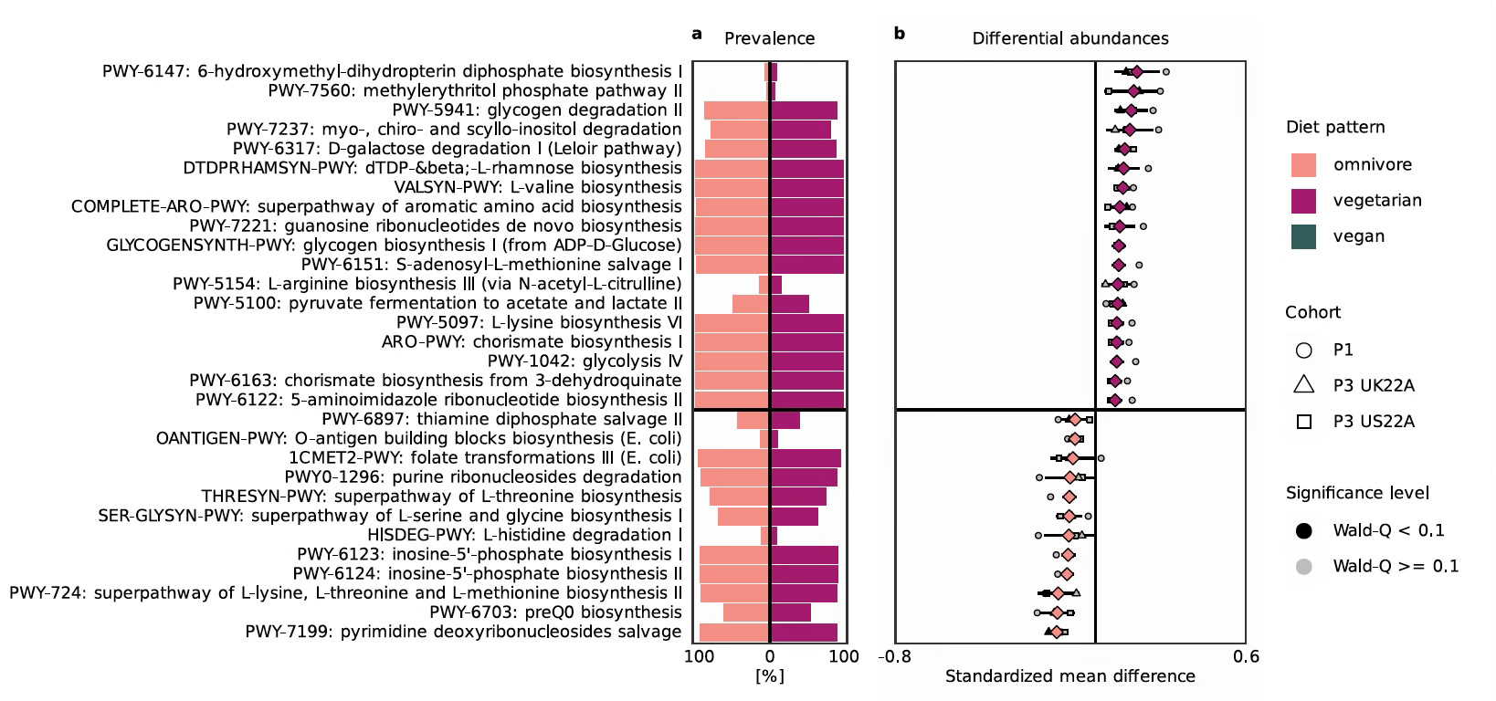 In a new paper by Fackelmann and colleagues in Nature Microbiology, the gut microbiome (using shotgun metagenomic sequencing) was assessed in over 21,500 participants from 5 different cohorts for three diet patterns: omnivore, vegetarian, and vegan. Overall there were 656 vegans, 1,088 vegetarians and 19,187, the vast majority, were omnivores. The 3 diets had microbial profiles—species-level genome bins (SGBs)— that differentiated them. The omnivore microbiome was driven by red meat and the primary microbes were Ruminoccous torques, Alistipes putresinis and Bilophila wadsworthis—microbes associated with inflammation and adverse cardiometabolic health outcomes, previously linked to inflammatory bowel disease and colon cancer. In contrast, the vegan microbial signature featured Lachnospiraceae, Butyricicoccus sp., and Roseburia hominis, all of which have had the opposite effect of reducing inflammation and promoting cardiometabolic health, in part by producing SCFAs like butyrate. The vegetarian diet SGB was in between these profiles. Biologic pathway analysis of the microbiome signatures showed marked difference between the omnivore and vegetarian diets (Figure below).