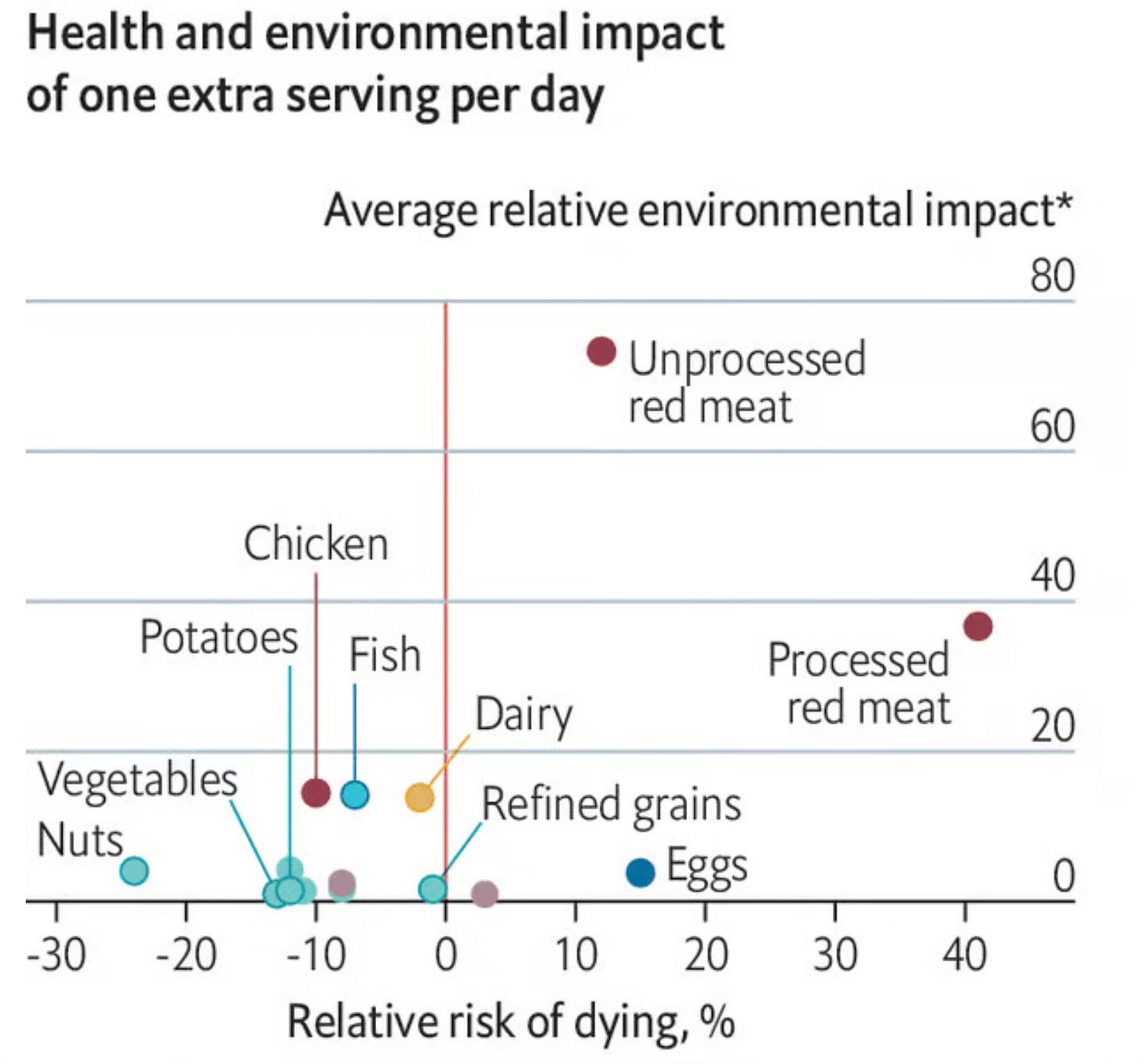 The preponderance of data on red meat intake—both processed and unprocessed—was summarized in a report by Clark and colleagues in PNAS for both relative risk of dying (all-cause mortality) and environmental impact (y-axis, below), with the higher the average relative environmental impact (AREI) index, the more detrimental. The graph shows how foods associated with improved outcomes were also associated with low environmental impacts.