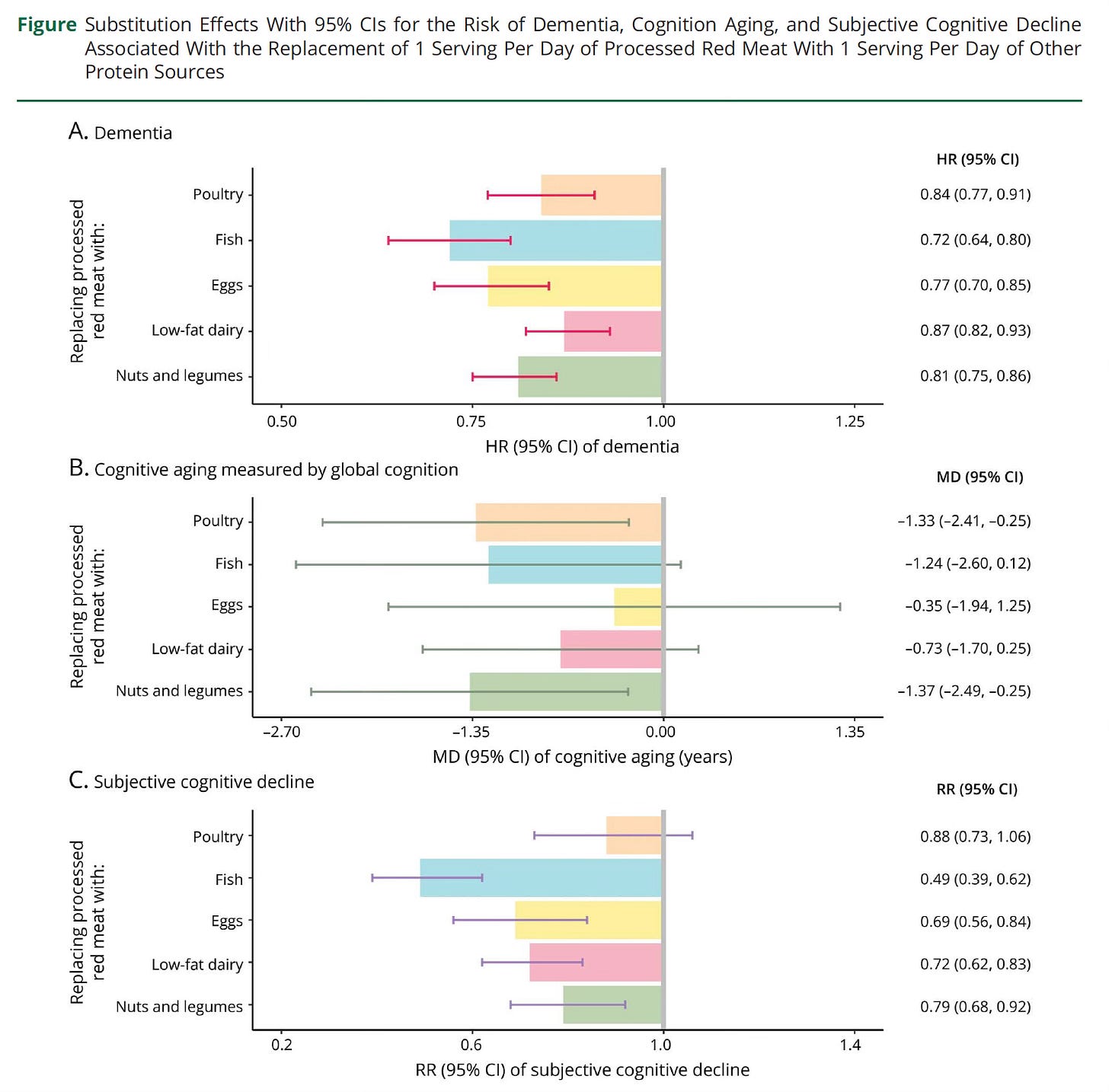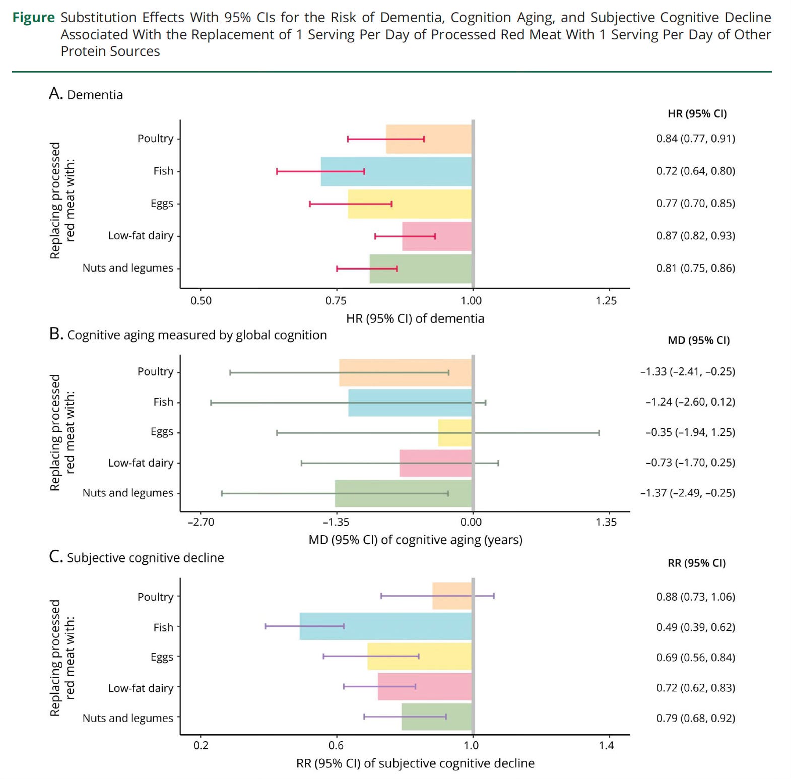 But, notably, the increased risk of dementia or cognitive decline was mitigated by replacing 1 serving per day of processed red meat with nuts or legumes (Figure, (see other healthier protein source substitutes) with a 19% reduced risk of dementia and 21% lower risk of subjective cognitive decline
