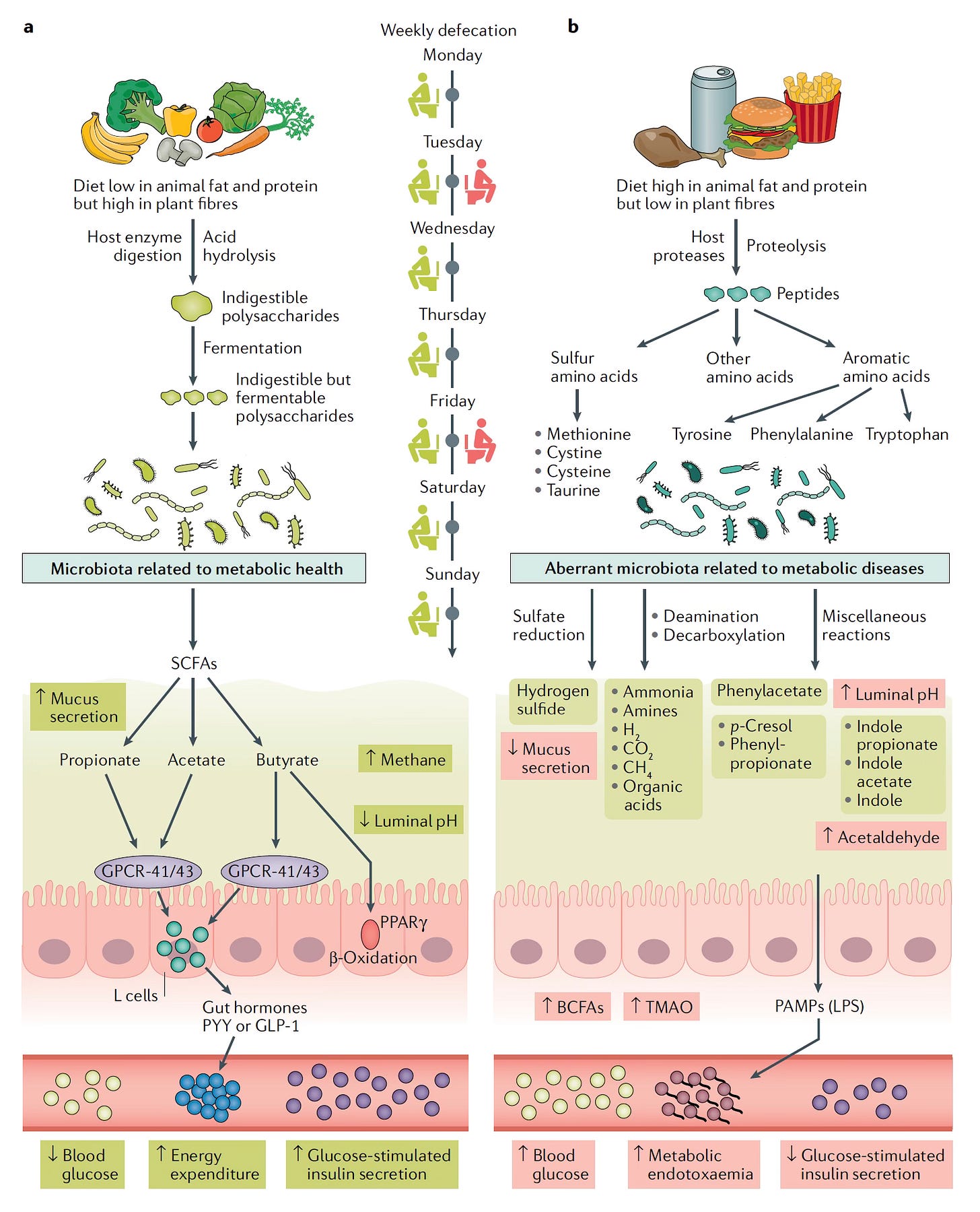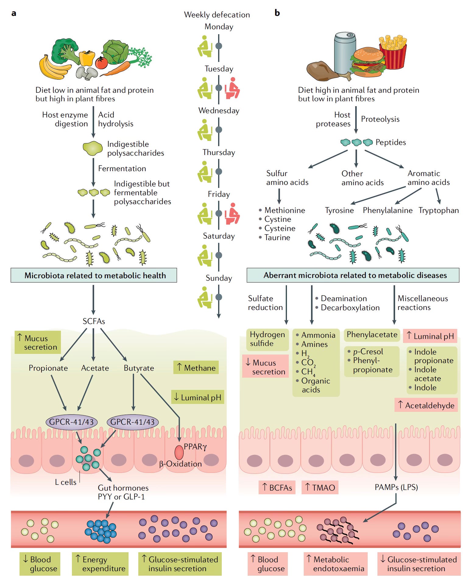 In contrast to plant-based diets that promote a healthy gut lining (mucosa), non-inflamed gut barrier, via indigestible polysaccharides, polyphenols, and promotion of short chain fatty acids (SCFA, such as propionate, acetate, and butyrate), red meat intake reduces SCFAs, can induce a leaky mucosa, leads to gut microbiome production of trimethylamine N-oxide(TMAO), which has been strongly associated with an increased risk of cardiovascular disease and potentially also with higher risk of colon cancer. High animal fat ingestion also promotes branched chain fatty acids (BCFAs) and pathogen-associate molecular patterns (PAMPs) as seen below. And yes, the change in transit time from these different diets generally affects weekly defecation.