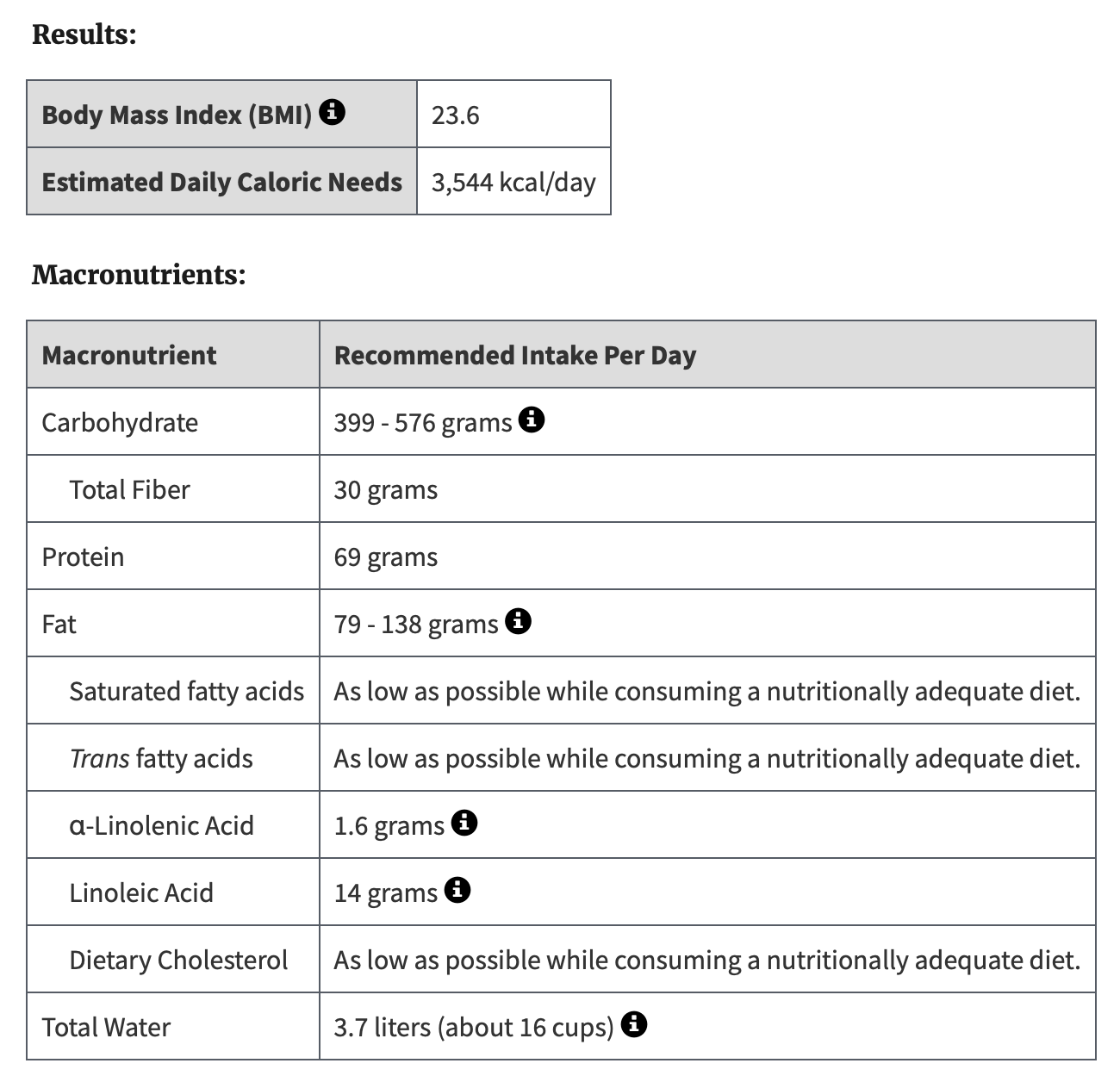 Much of the current guidance via the National Academies’ Recommended Dietary Allowance (RDA) is based on relatively scant evidence, and is fairly similar for all people. You can get your Dietary Reference Intakes (DRI) calculated here; my US Department of Agriculture recommendations are below (vitamins and minerals are not listed). When I put in parameters for a much younger man, the output didn’t change very much, and the estimated daily caloric needs is highly influenced by your input of “active” or “very active.”