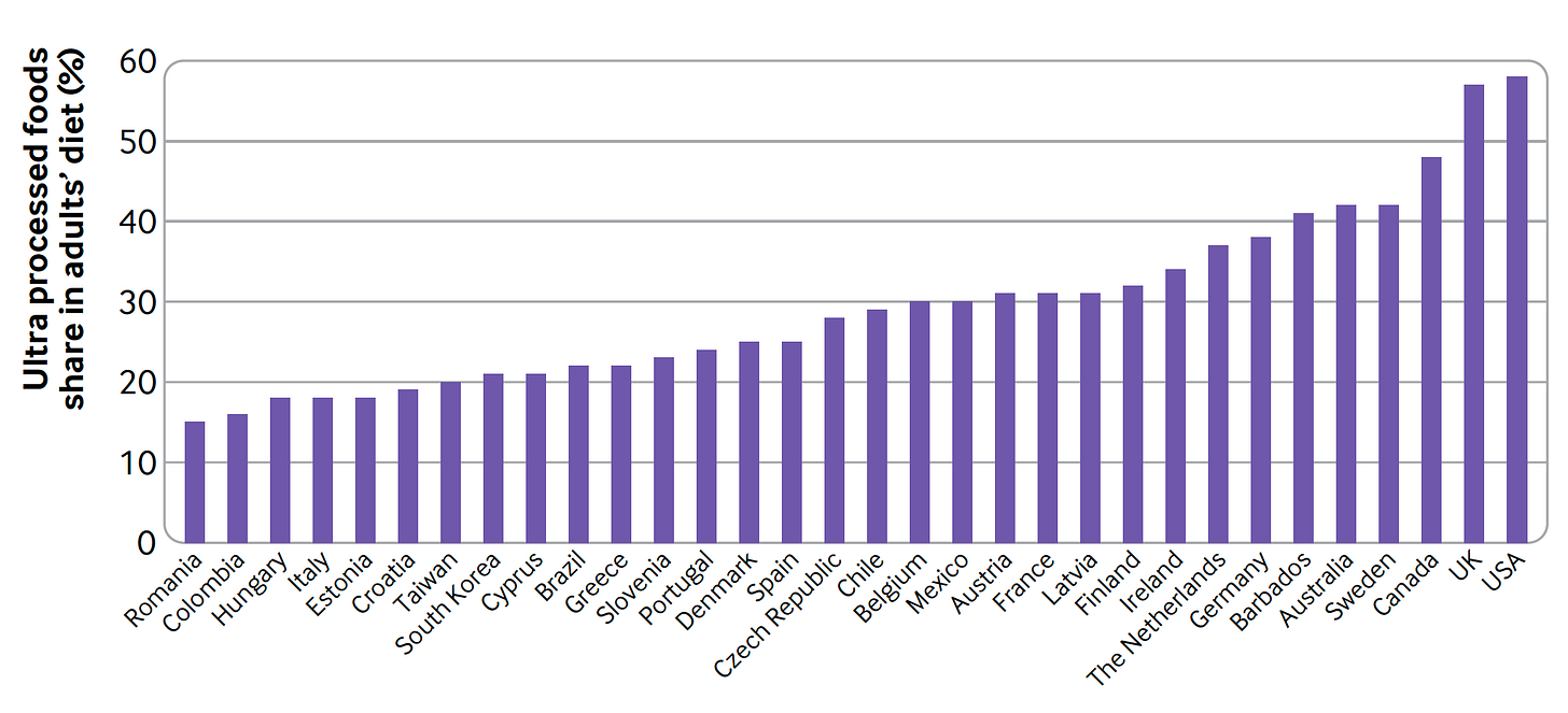 Especially when you consider that the USA leads the world at near 60% of its diet in adults that is UPF and in today’s print edition of the New York Times Magazine, Dr. Helen Ouyang pointed out that the diet in children is about 70% UPF. If you read what happened to Chris Van Tulleken after eating an 80% UPF diet for 1 month, with baseline and follow-up blood tests for inflammation and MRI brain scans, you’d be alarmed.
