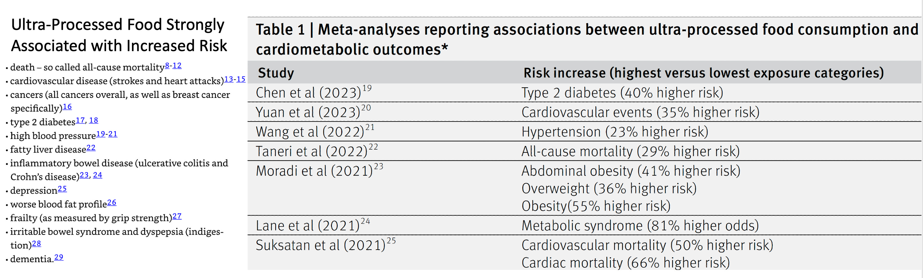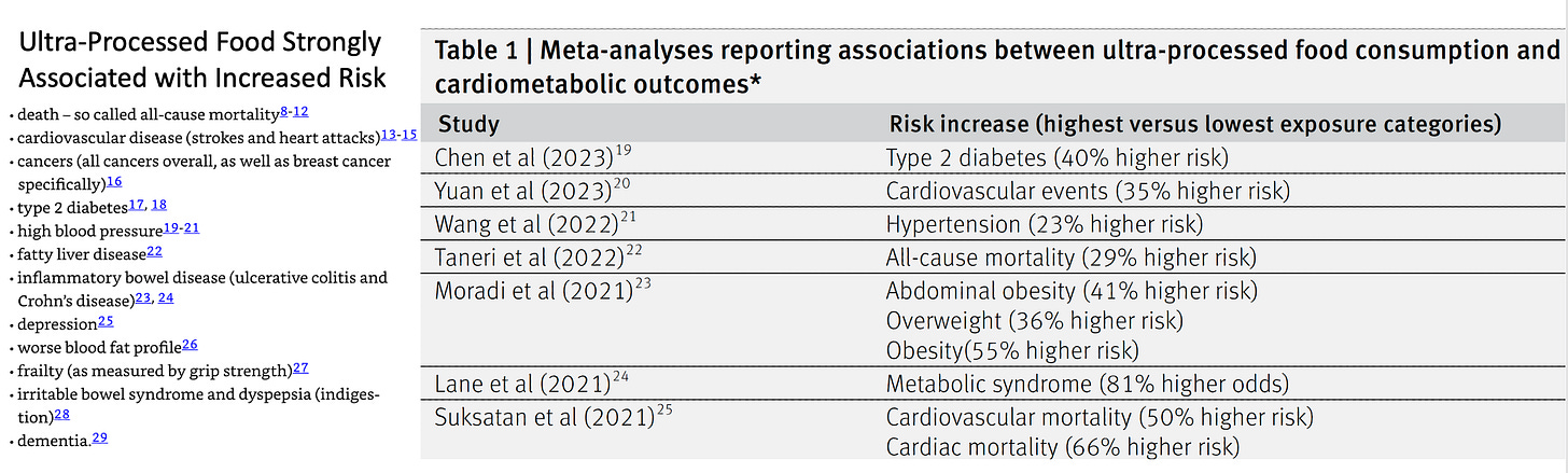 A very compelling case against ultra-processed foods (UPF) was made in Chris Van Tulleken’s book (left panel, below) and a recent BMJ review (right panel), as summarized in the Table below. When you review the 2 lists and the evidence that’s cited, it’s hard to believe that we’re not doing anything about it.