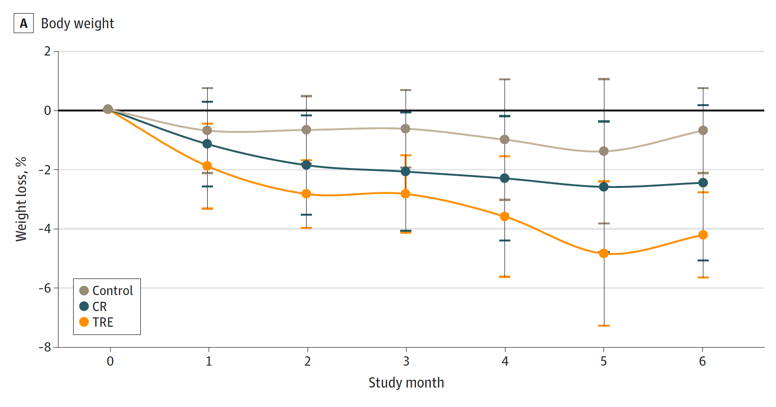 There has been much written about caloric restriction and promoting healthspan over the years, but it’s yet unproven to promote longevity in humans. A recent publication of a small randomized trial of 75 people with Type 2 diabetes looked at time-restricted eating (TRE), calorie restriction (CR), or controls out to 6 month follow-up. As you can see in the graph below, TRE (during 8 hours in the day, between 12 N and 8 PM) fared well for weight loss, had similar results as CR for lowering HbA1c, and was found to be much easier to adhere to than calorie restriction among the study participants.