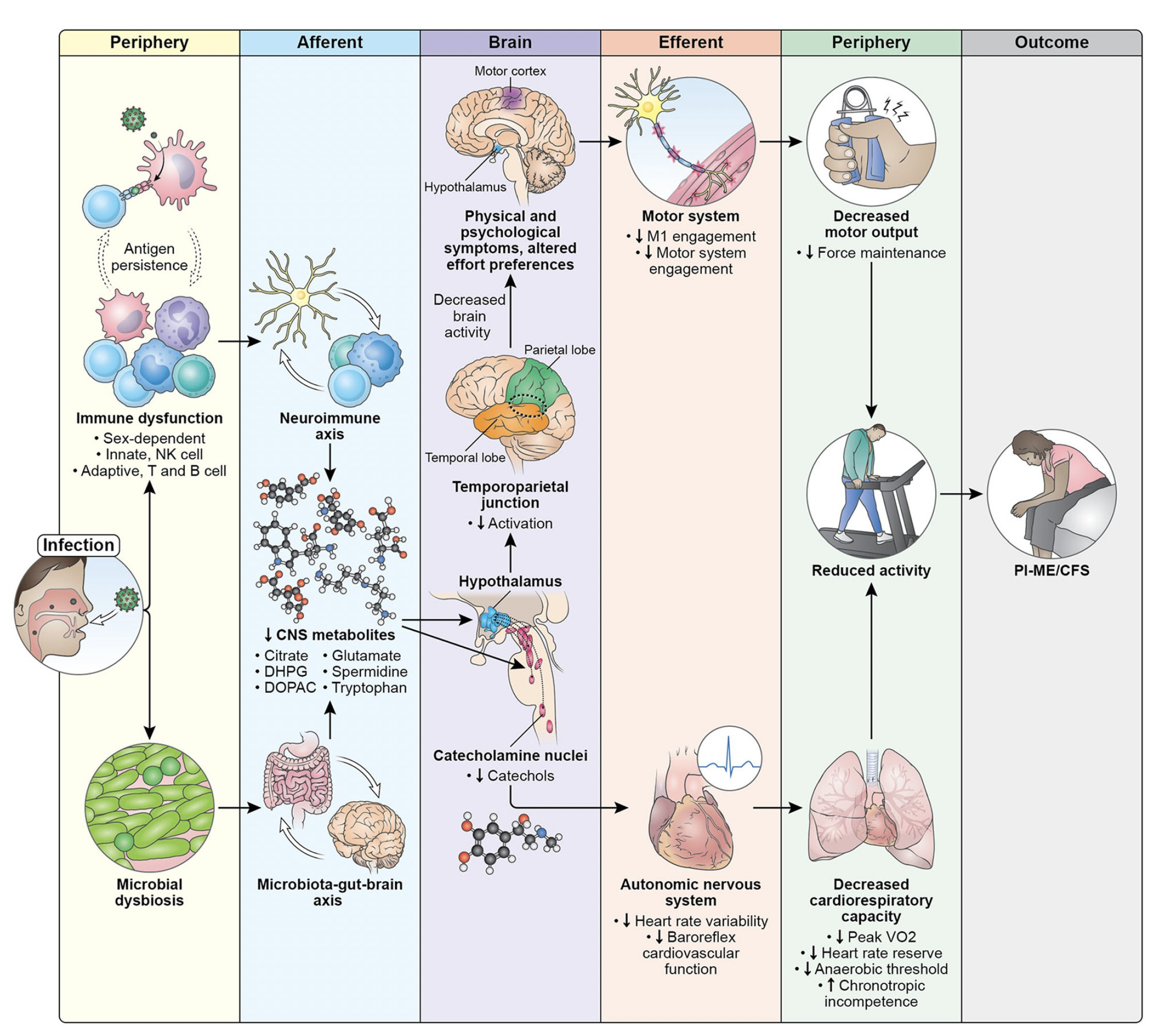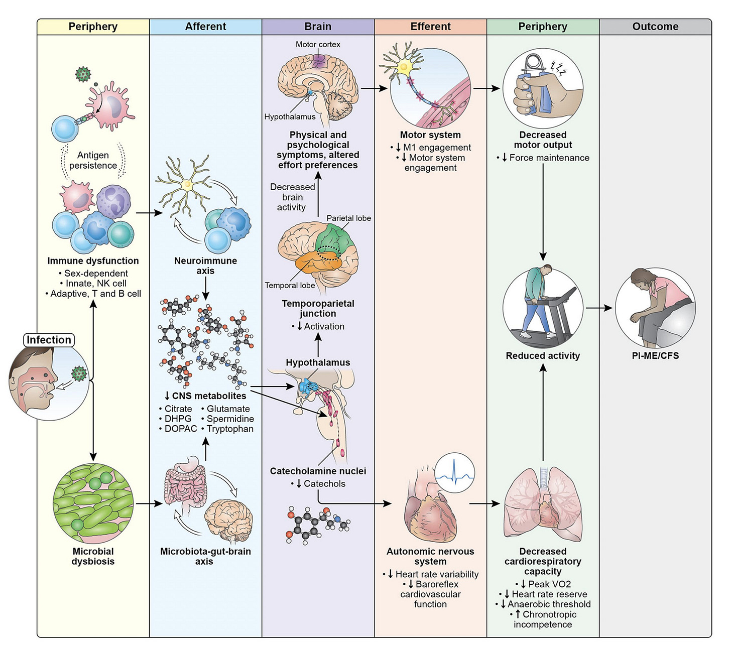 The 8-year, long awaited NIH project results were published in a 70-page manuscript. Like the BBB study above, the number of participants studies were small, but compensated by extensive characterization and suitable matched controls. With the considerable overlap of many of the symptoms of ME/CFS and Long Covid, the results are notable: signs of persistent chronic antigen stimulation with immune system dysregulation (with T cell exhaustion) along with multi-system disruption, some of which is central nervous system regulated, with specific regions of the brain implicated, and overall summarized in the graphic below.