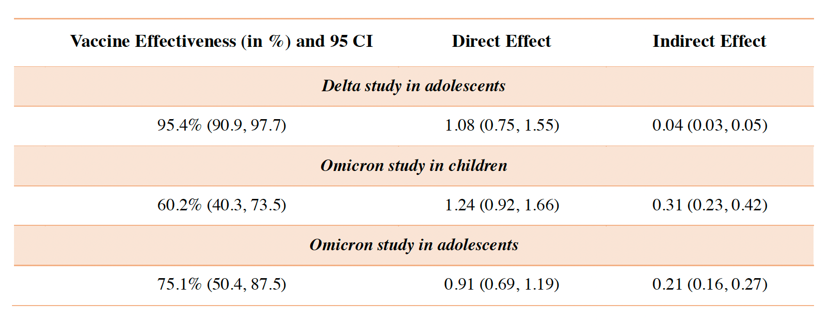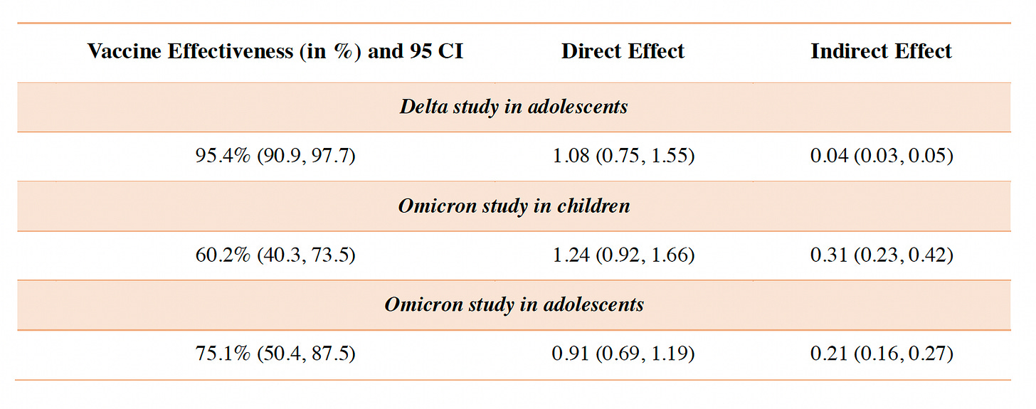 And a new preprint report on protection in children and adolescents which looked at different variants (Delta and Omicron) and cause and effect relationship for direct benefit of vaccination, summarized in the Table below. More protection was found in teens than children with the range of 60 to 75%.
