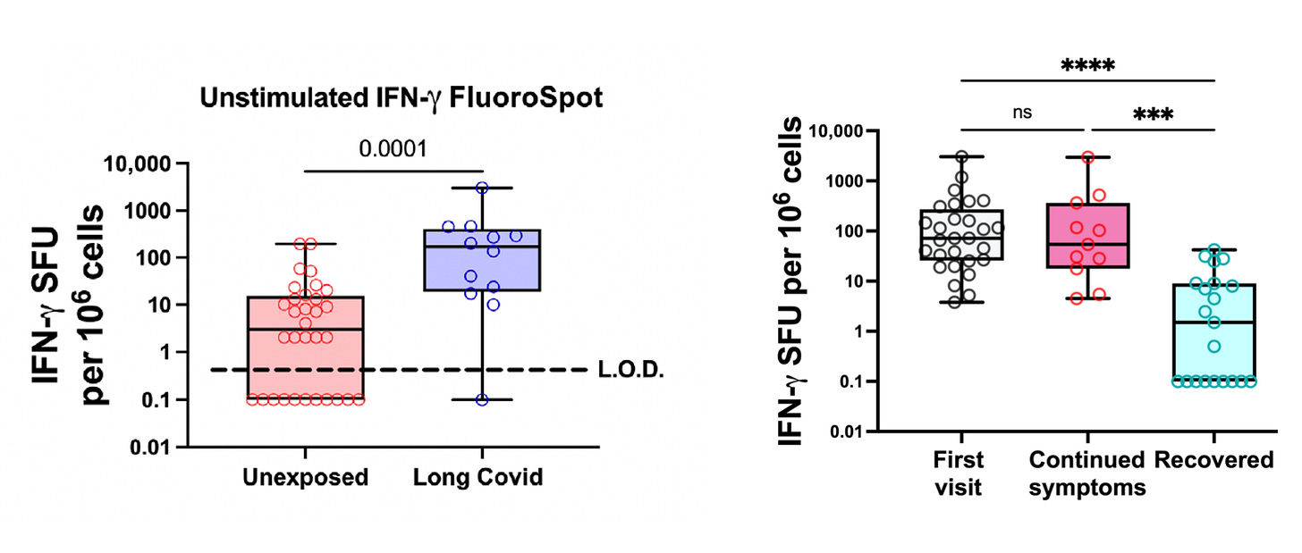 A new report assayed interferon-gamma, part of the first line of defense of innate immunity to a SARS-CoV-2 infection. Individuals with Long Covid had persistent elevation after the acute phase, and during follow-up serial assessment of this biomarker showed resolution among the participants with symptom resolution. This will need further assessment, but if replicated and extended, it might fulfill a major unmet need for both confirmation of diagnosis and a surrogate measure for treatments that are being assessed in prospective clinical trials, no less an objective metric for correlation with symptoms.