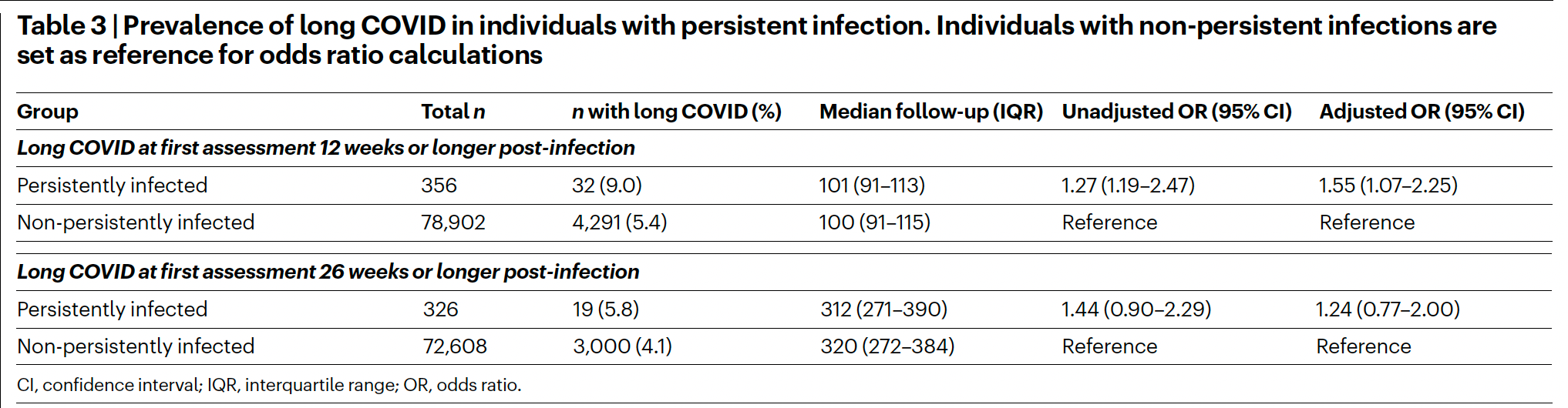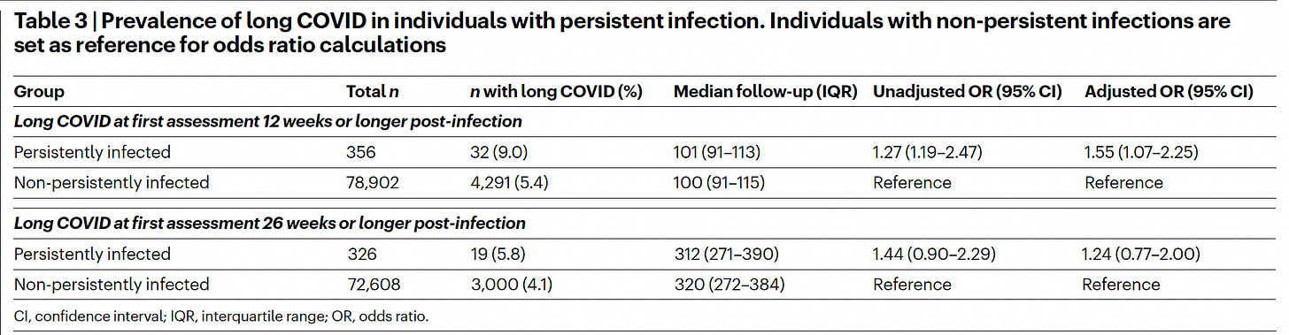 The risk of Long Covid was 55% increased in people with 12 weeks or more of persistent infection, 24% increased in those with 26 weeks or more (adjusted odds ratio, Table below)