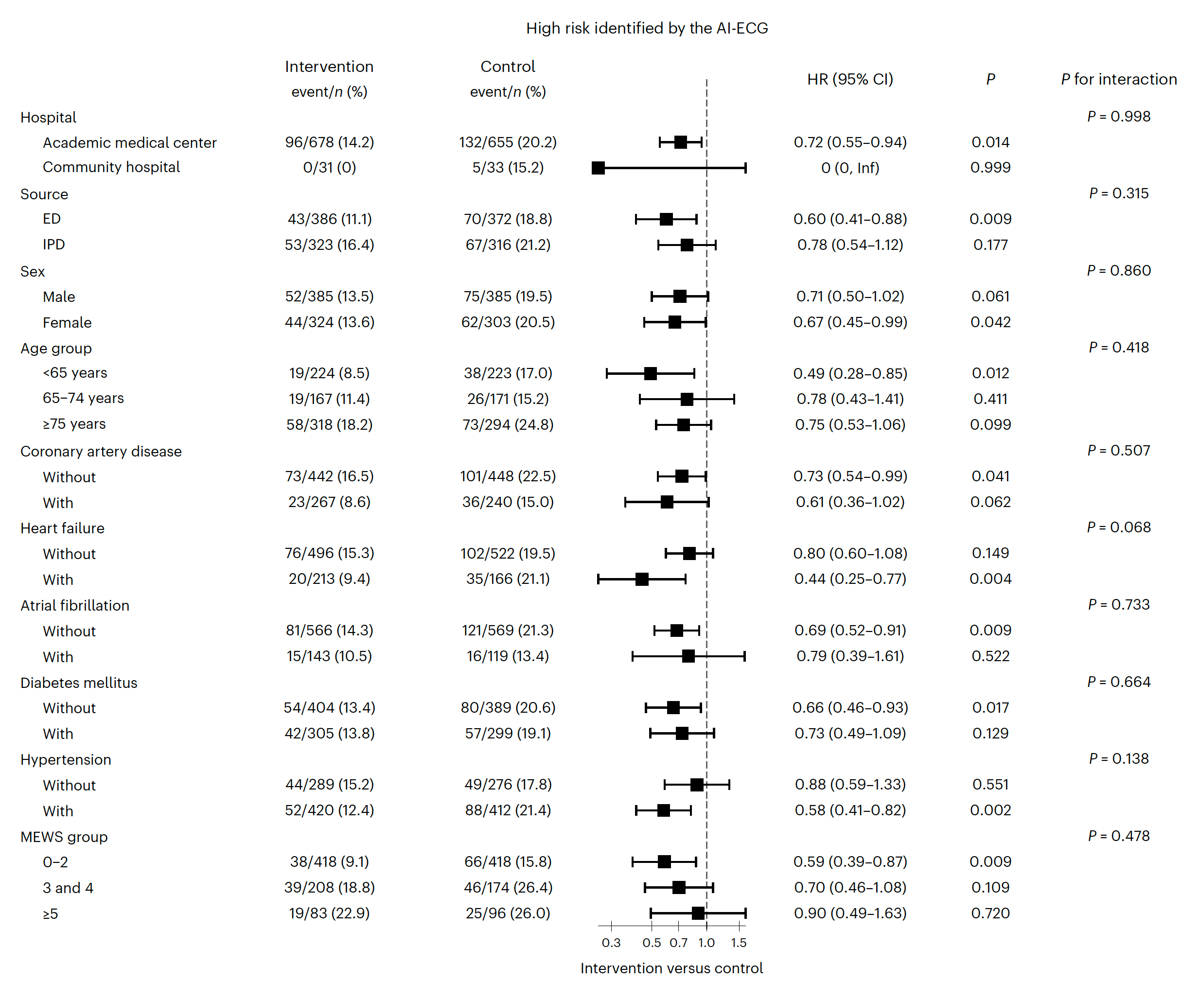 The main limitation of the trial was inability to determine the precise mechanism of benefit for reduction of mortality. The AI-alert typically led to transfer to intensive care unit and heightened awareness of risk, and these high-risk patients died from a variety of causes, not just heart attack or arrhythmias.