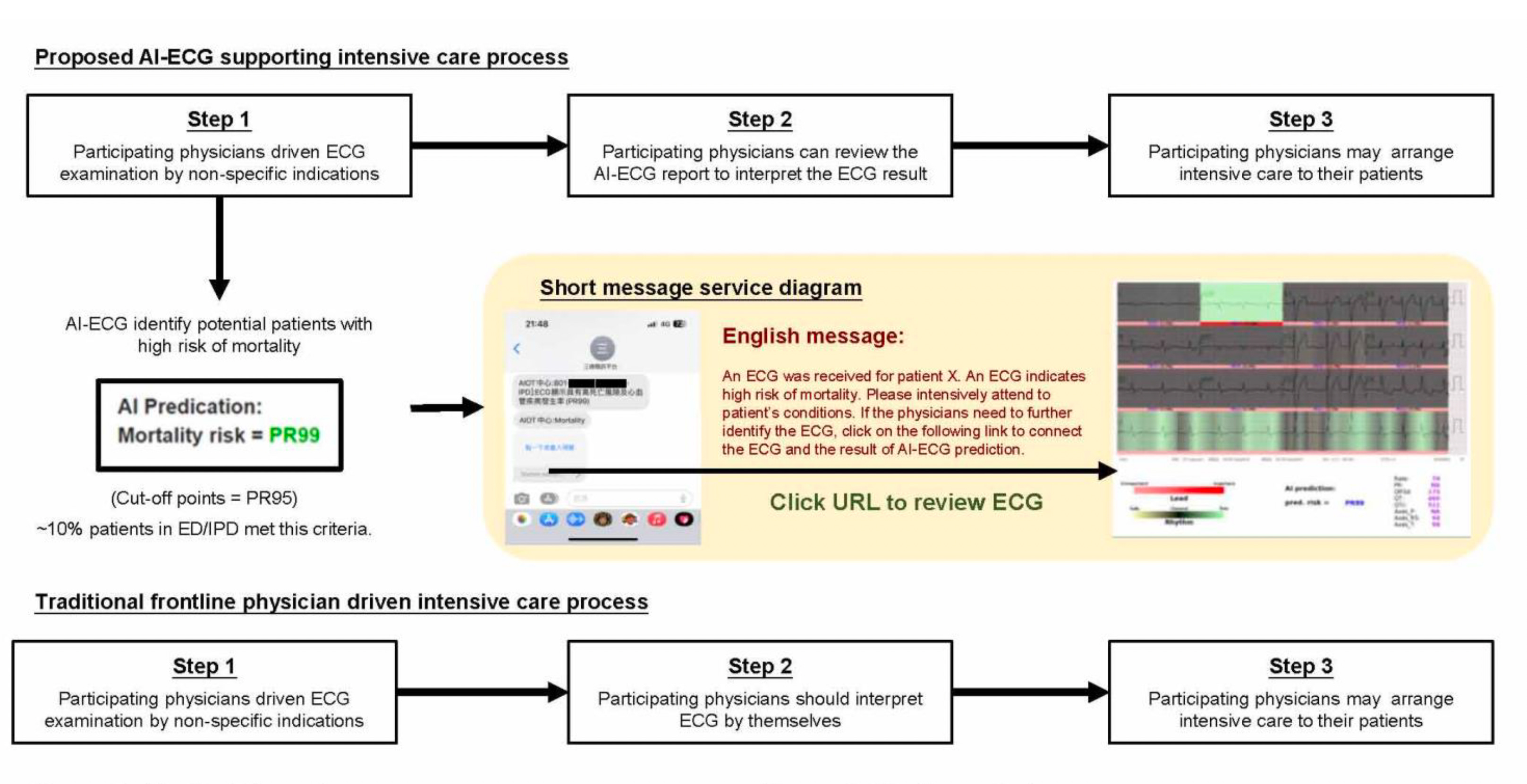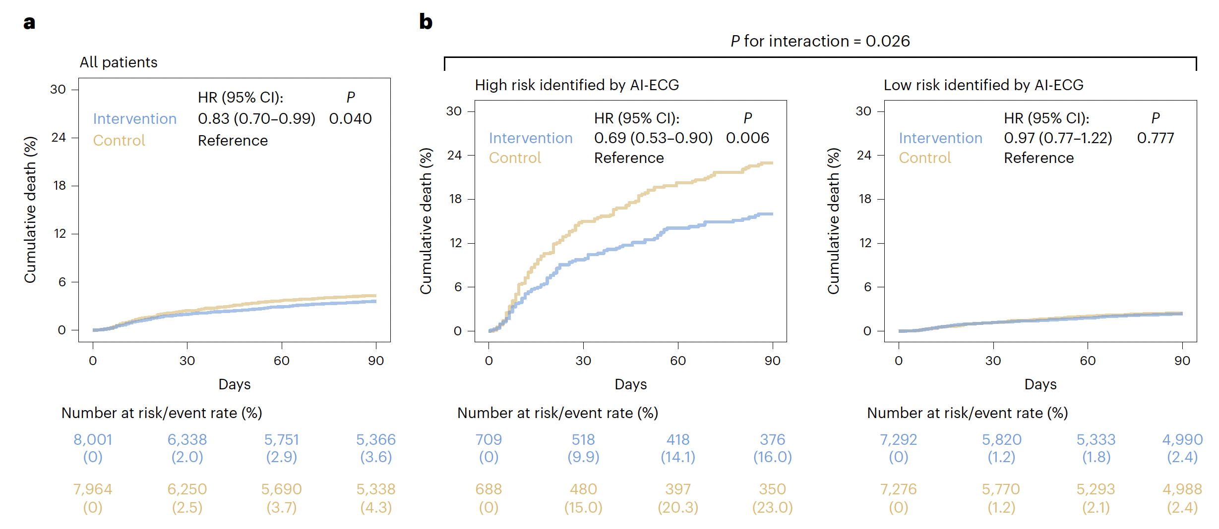 Today that changed. In a paper published at Nature Medicine, nearly 16,000 patients at 2 hospitals in Taiwan were randomly assigned to their physician getting an AI alert of their patient’s electrocardiogram compared to conventional care (single-blind design), with the primary endpoint of all-cause mortality at 90 days.