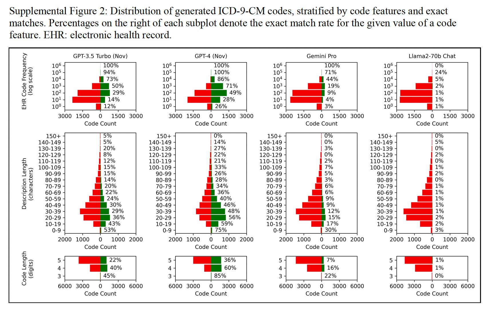 Assessment of generative A.I. for automated coding. This was supposed to be a sweet spot for A.I., but in a study at Mount Sinai of >7,600 diagnostic codes (ICD) and >3,600 procedure (CPT) codes comparing 4 models, all models performed poorly (GPT-4 was the best vs Gemini Pro, GPT 3.5, Llama2))