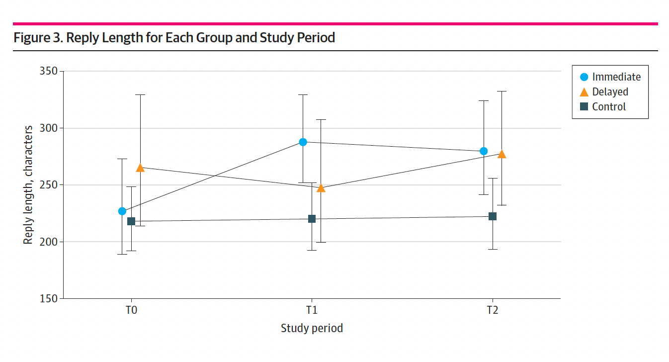 A small randomized study by UCSD assessed whether generative A.I. could reduce writing time replies to patients—it failed to do that, and actually increased time to reply with longer length. The physicians liked the “empathic tone” of the replies. These were draft replies not actually sent to patients.