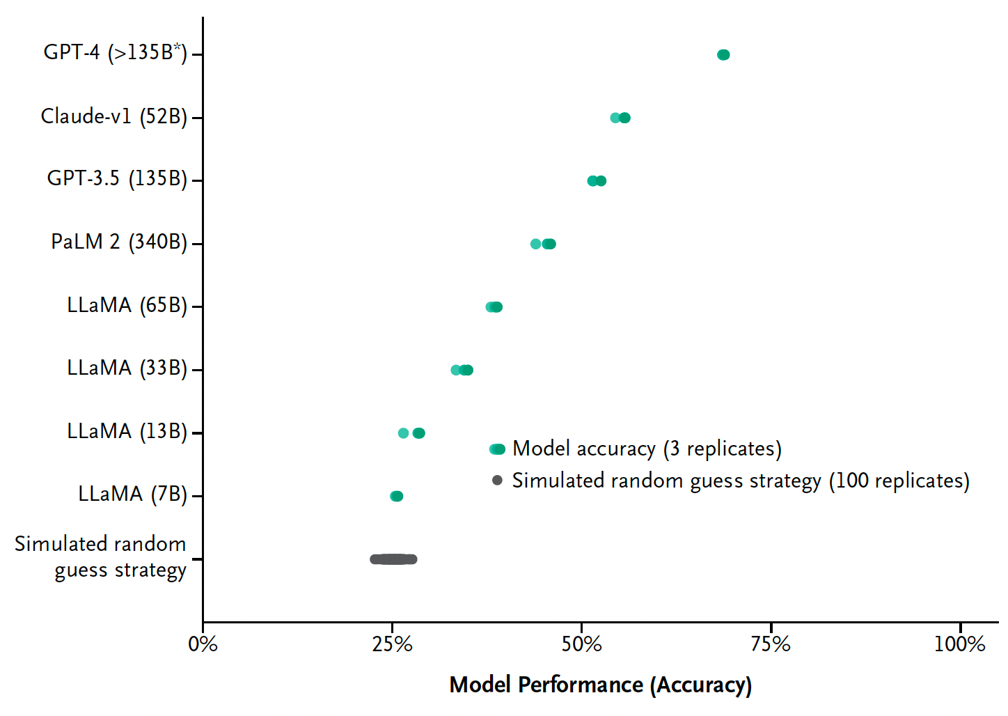 Over 2,000 oncology questions were posed to 5 generative A.I. models and only 1 reached the previously established human benchmark (>50%) for performance (GPT-4). All had significant error rates.