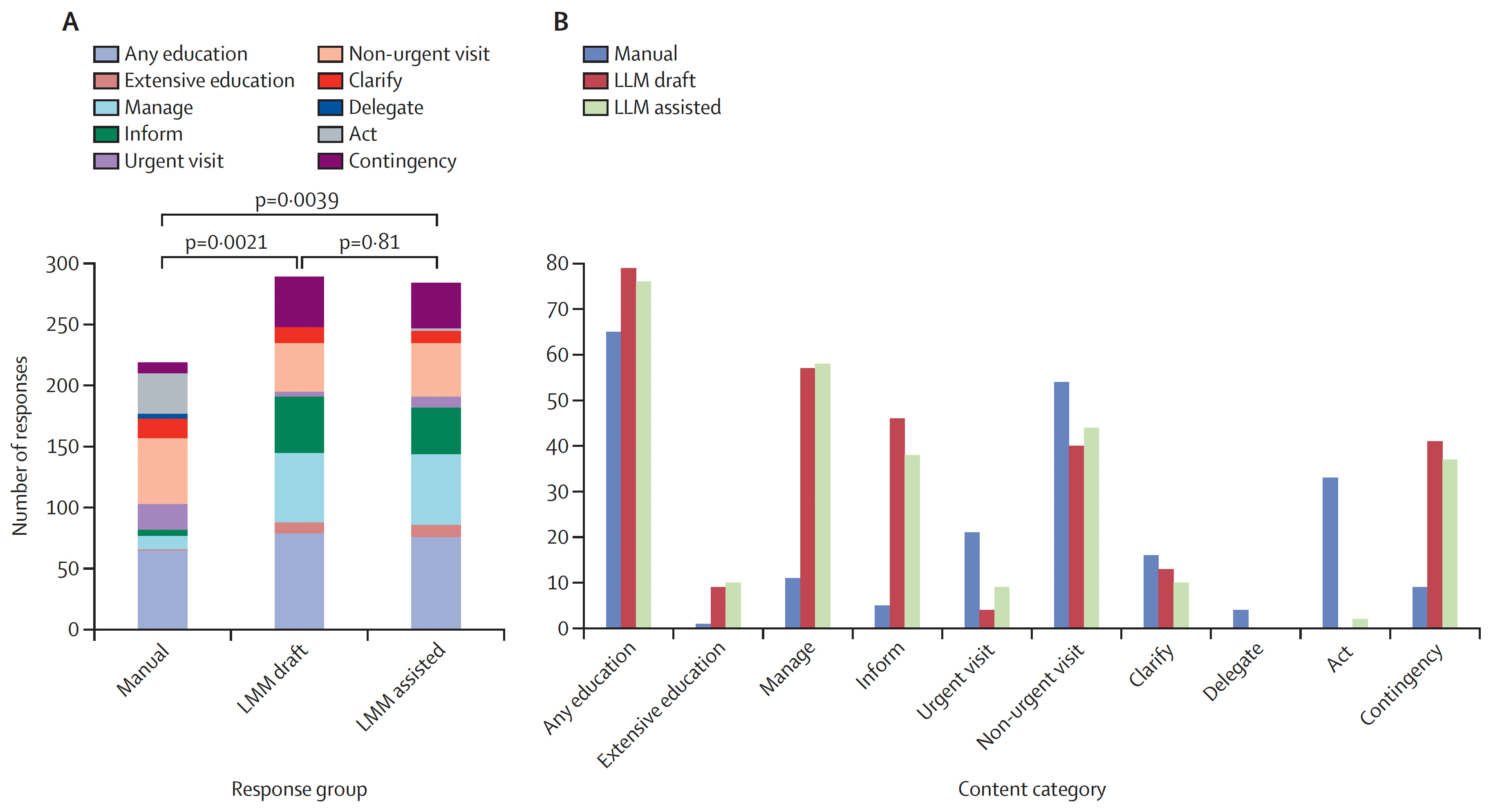 LLM response to medical questions on cancer care, a simulation study comparing human manual draft vs LLM, and LLM-assisted, found an important safety signal. Specifically, “It was felt by the assessing physicians that the LLM drafts posed a risk of severe harm in 11 (7·1%) of 156 survey responses, and death in one (0·6%) survey response.”