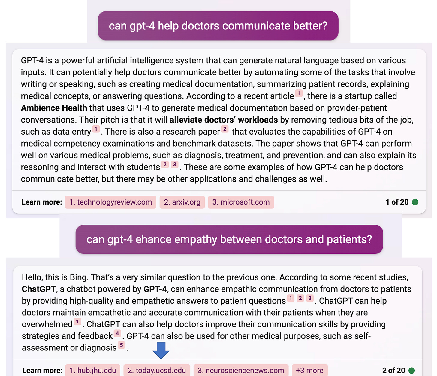 I turned to GPT-4 (by way of Bing Creative) to prompt its ability for it to enhance communication and empathy between doctors and patients, as shown below. Ironically, it cited the JAMA Internal Medicine paper from today (blue arrow appended). That finding of citing a paper from today is not to miss, since ChatGPT had a cutoff for inputs sometime in 2021, whereas GPT-4, not only multimodal, but apparently quite up to date.