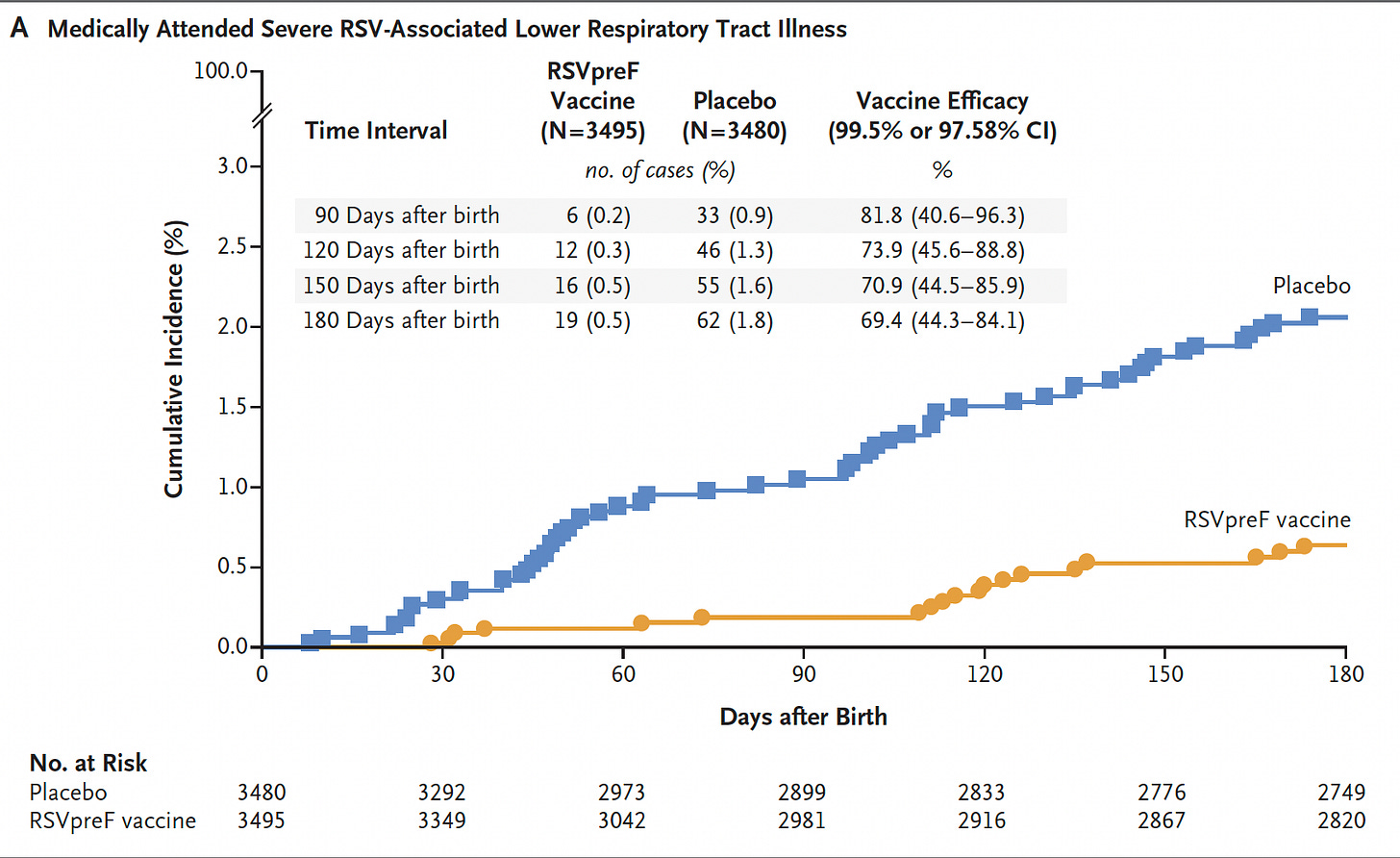 In the past several weeks, 4 randomized trials of RSV vaccines in pregnant women and older adults have been published in the New England Journal of Medicine. Recall it takes an average of 8-10 years from the identification of the causative pathogen to a successful vaccine (emphasis on the successful category). And for many pathogens, as shown in the graphic below, adopted originally from Max Roser and Edouard Mathieu at Our World in Data, there are no vaccines—like malaria, TB, Dengue fever, and HIV, up to 140+ years later! I have added the recent success story for RSV to put it in context—the 67-year journey. Of course, none of these long incubation periods compare with the Covid vaccines which were developed and validated in just 10 months, thanks to relentless science advances of mRNA and nanoparticles, and structural biology, for over three decades. As it turns out, we’re seeing the windfall of that seminal work pay off for RSV and several other pathogens.