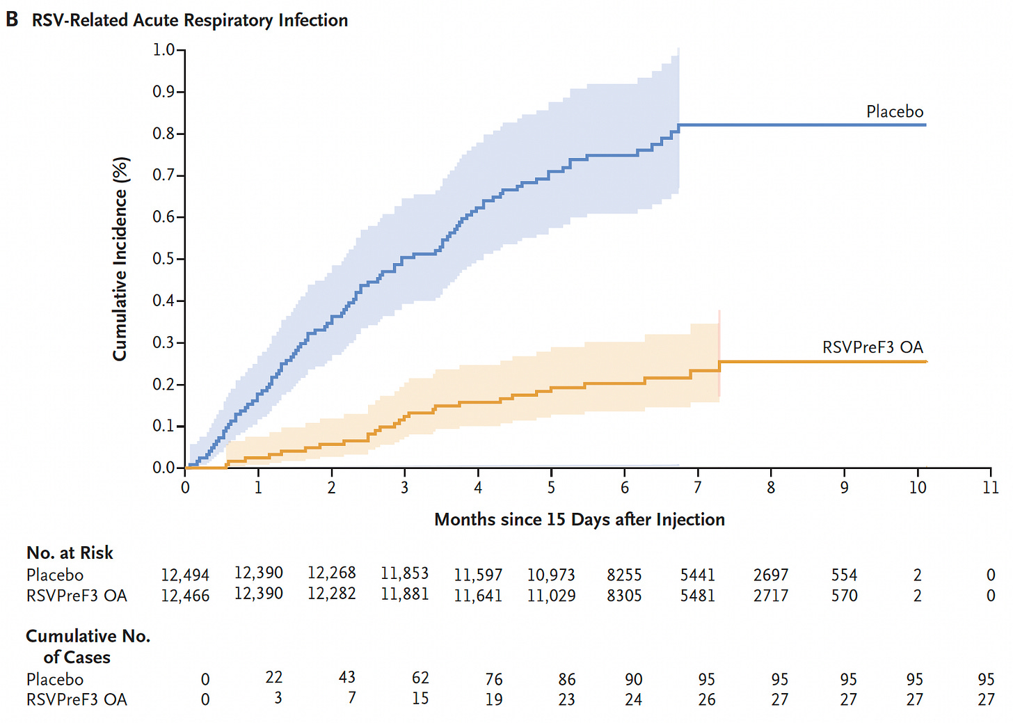 The four trials were all 1-dose vaccines from 3 different manufacturers: Glaxo Smith Kline (GSK), J&J, and Pfizer. The GSK trial was in ~25,000 participants age 60+ (mean age 70). One dose led to a 94% efficacy against severe RSV pneumonia and 72% efficacy against RSV acute respiratory infection (graph below). There are 2 RSV subtypes, A and B, with higher efficacy against A (81-85%) as compared with B (70-72%)