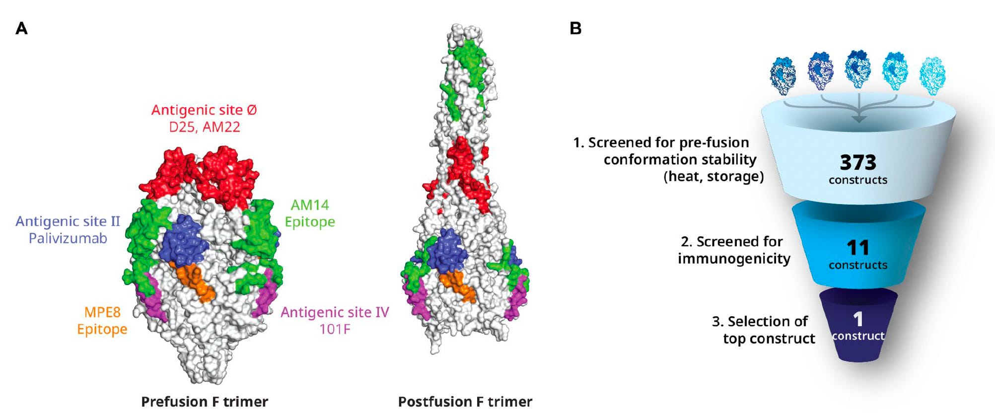 It’s about structure-based design of the RSV vaccine, which got a giant leap in 2013 with the publication of a paper in Science by Jason McClellan and colleagues at the NIH Vaccine Research Center with determination of the atomic-level structure of the RSV fusion (F) protein (Think of F like the SARS-CoV-2 spike S protein, that drives the membrane fusion of the virus and the host cell). This work unraveled the importance of the prefusion F, eliciting higher neutralizing antibodies than wild-type RSV F, using the DS-Cav1 antigen (shown below). But the prefusion F, which became the principal target for a RSV vaccine, is chemically unstable, so it took considerable work to rise above this challenge: to make a stable, highly immunogenic prefusion F antigen. I should add this crystallization of proteins back in 2013 was painstaking, laborious, multi-year work that couldn’t be rapidly accomplished with the help of AlphaFold2, the AI platform developed by DeepMind that now rapidly (minutes to hours) and accurately predicts 3D structure from amino acid sequences. It is noteworthy that AlphaFold2 was used to come up with a whole new delivery method of proteins into cells, a “molecular syringe” system, as published by Feng Zhang and colleagues in Nature last week
