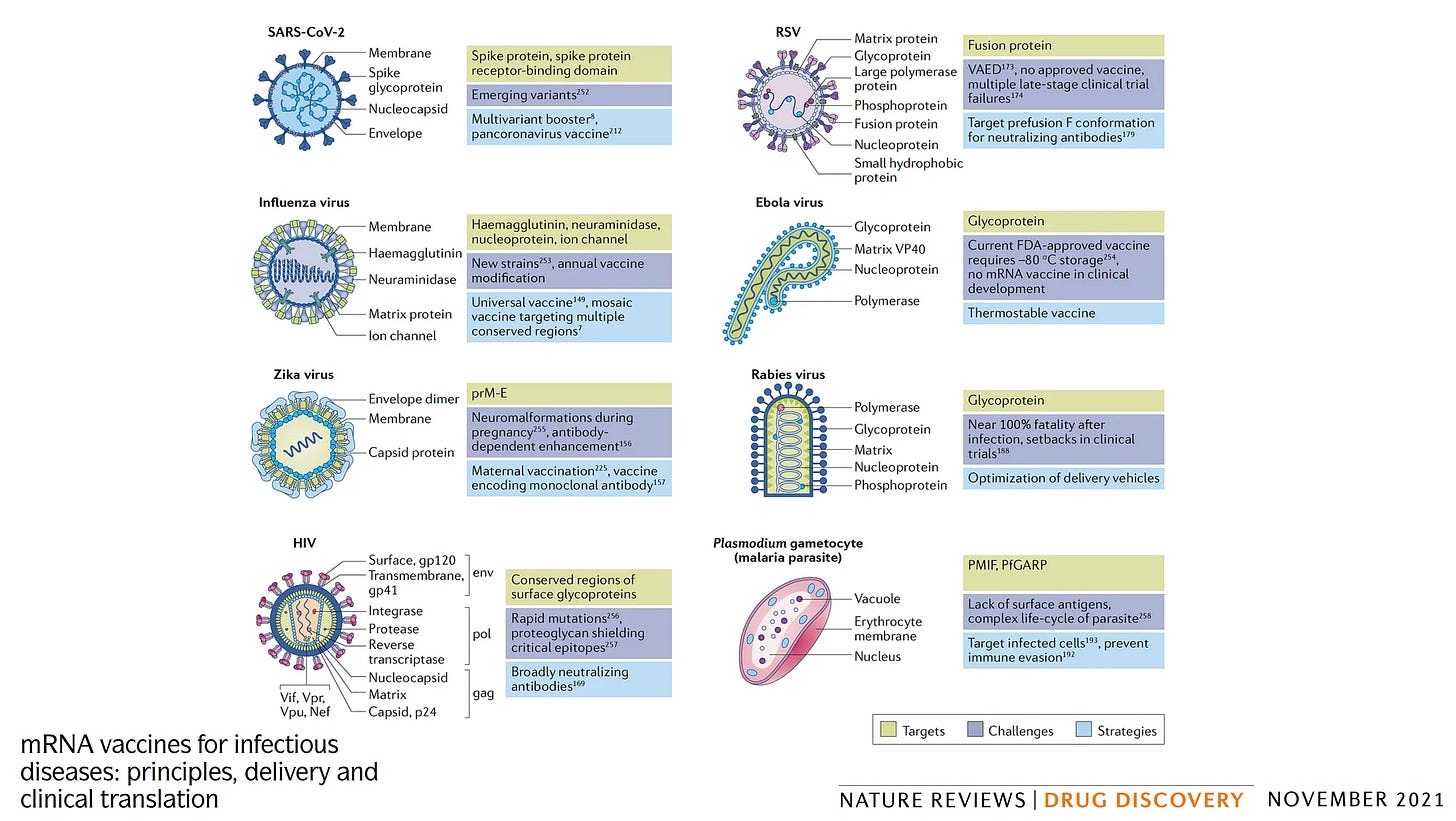 This —mRNA/nanoparticle delivery of structure-based vaccines— has set up multiple success stories across so many pathogens that were previously not approachable, as nicely reviewed in this article and graphed below. This now even includes, for the first time, a universal flu vaccine that was effective against all 20 A and B subtypes in multiple experimental models.
