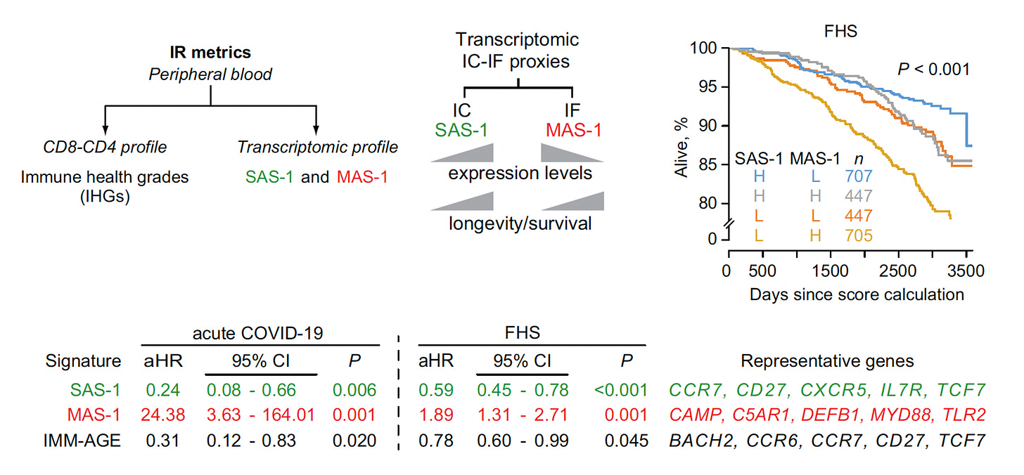 A study that assessed CD4+ and CD8+ cells (immune health grade) and gene expression (transcriptomics) to get at the balance of immunocompetence (IC) and inflammation (IF) for quantifying immune resilience. Think of it as major refinement beyond the neutrophil to lymphocyte ratio. As seen below, high SAS-1 (gene expression linked with immunocompetence) and low MAS-1 (gene expression linked with inflammation), was associated with best survival over 10 years in the Framingham Heart Study (FHS).
