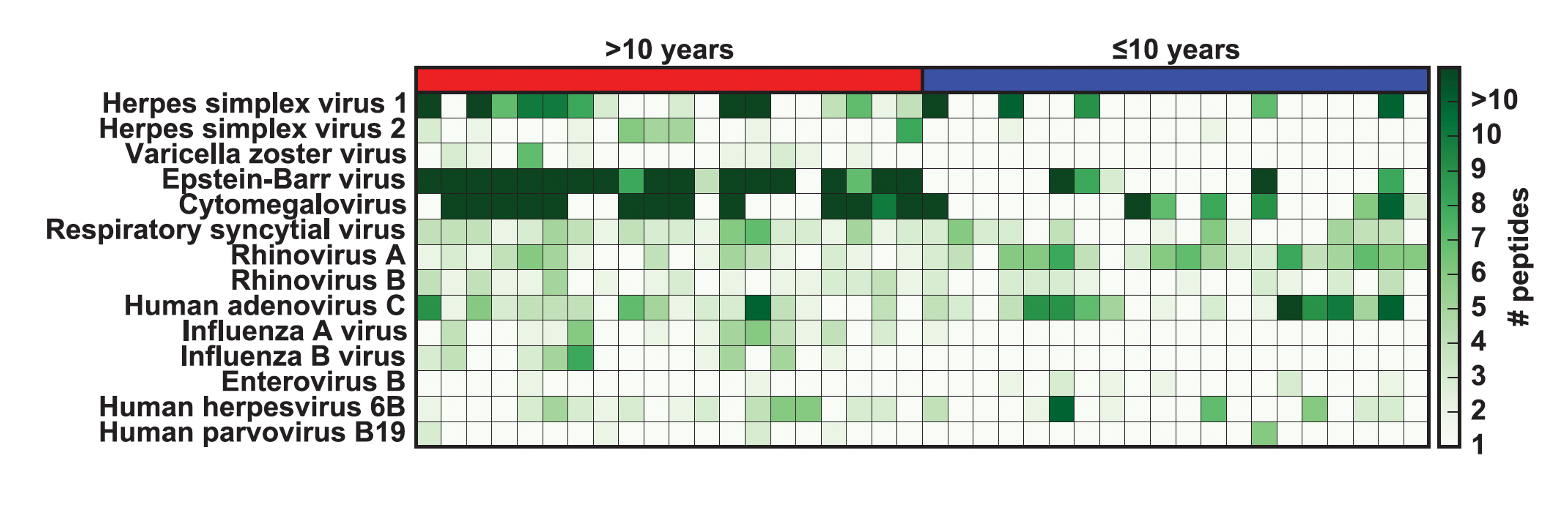 Back in 2015, I was excited about a report in Science on VIrScan. A drop of blood detecting antibodies— to >1,000 virus strains from over 200 species—could tell us about every virus a person has been exposed to and when for as little as $25! A sample of output for 14 virus strains is shown below