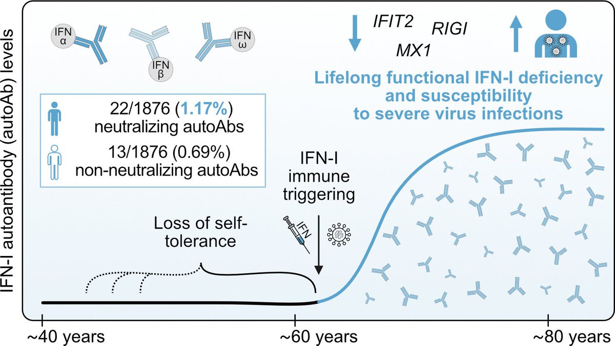 This past week it was reported that about 2% of people aged 60 years and beyond develop anti-interferon-1 (IFN-1) antibodies that are persistent and linked to vulnerability to severe illness from viral infections.