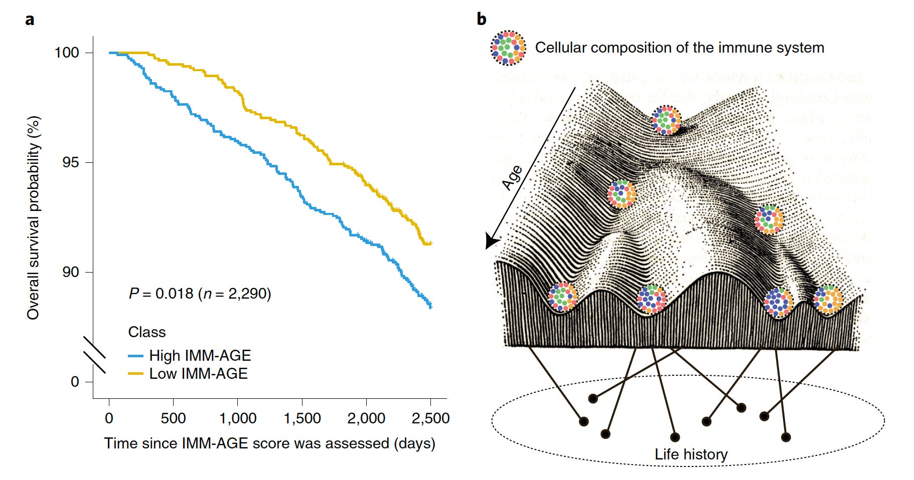An IMM-AGE score based on the profile, applied to Framingham Heart Study Offspring participants. was associated with all-cause mortality during follow-up. It also was better than DNA methylation (epigenetic) clocks for predicting mortality.