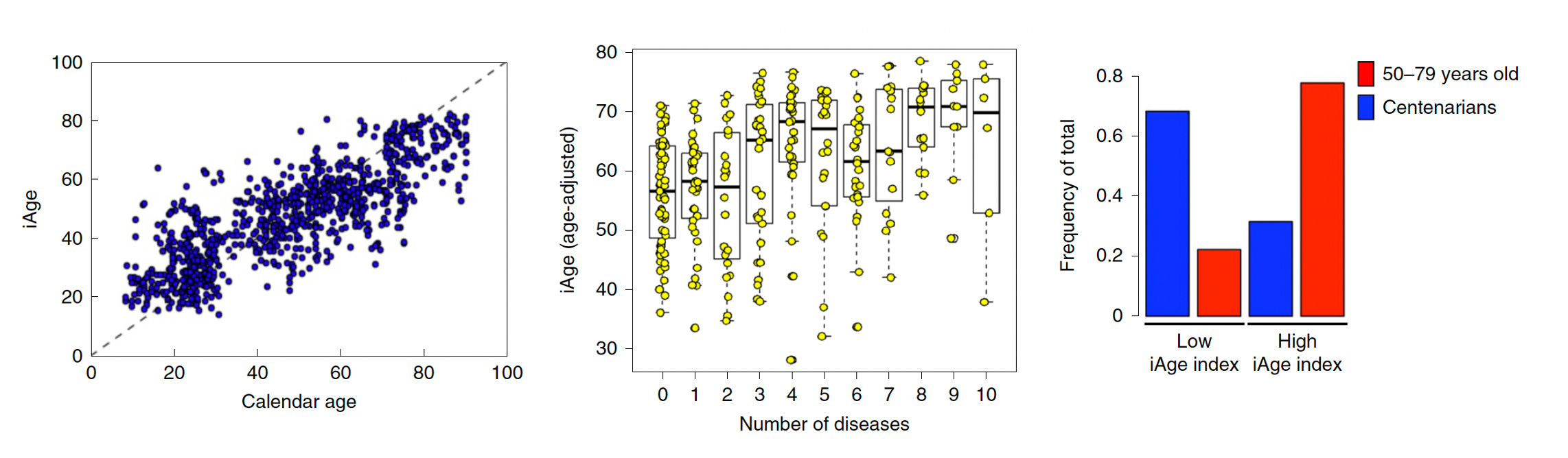 The iAge was derived from deep learning A.I. of circulating blood markers from 1,001 participants aged 8 to 96 years, including 50 cytokines, chemokines and growth factors, gene expression, immune cell phenotypes and counts (such as CD4+, CD8+, B cells), and cytomegalovirus (CMV) exposure.
