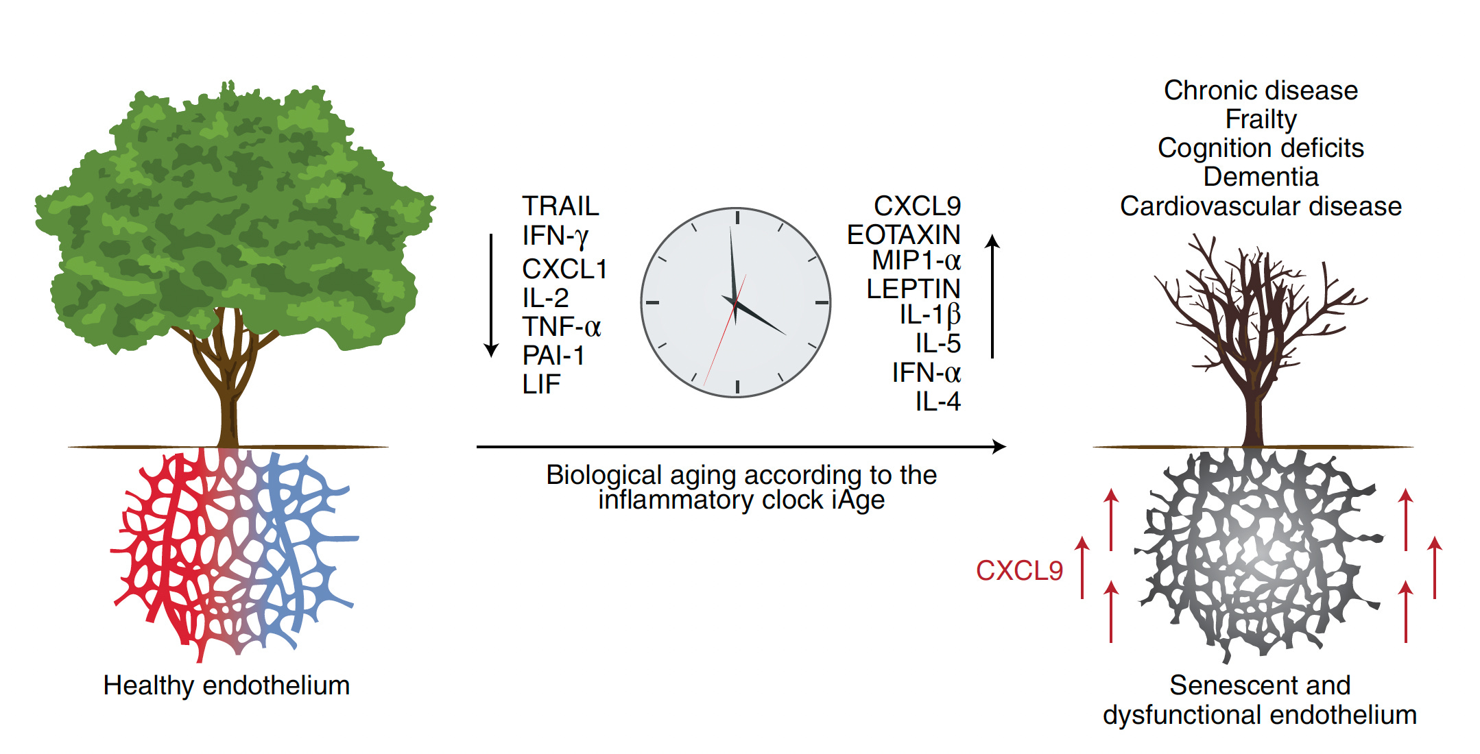 By studying aged endothelial cells and differentiating induced pluripotent stem cells into endothelial cells, CXCL9 was identified as a master regulator of blood vessel function and cell aging, as schematically (and simplified) shown below. Silencing CXCL9 reversed these age-related endothelial changes.