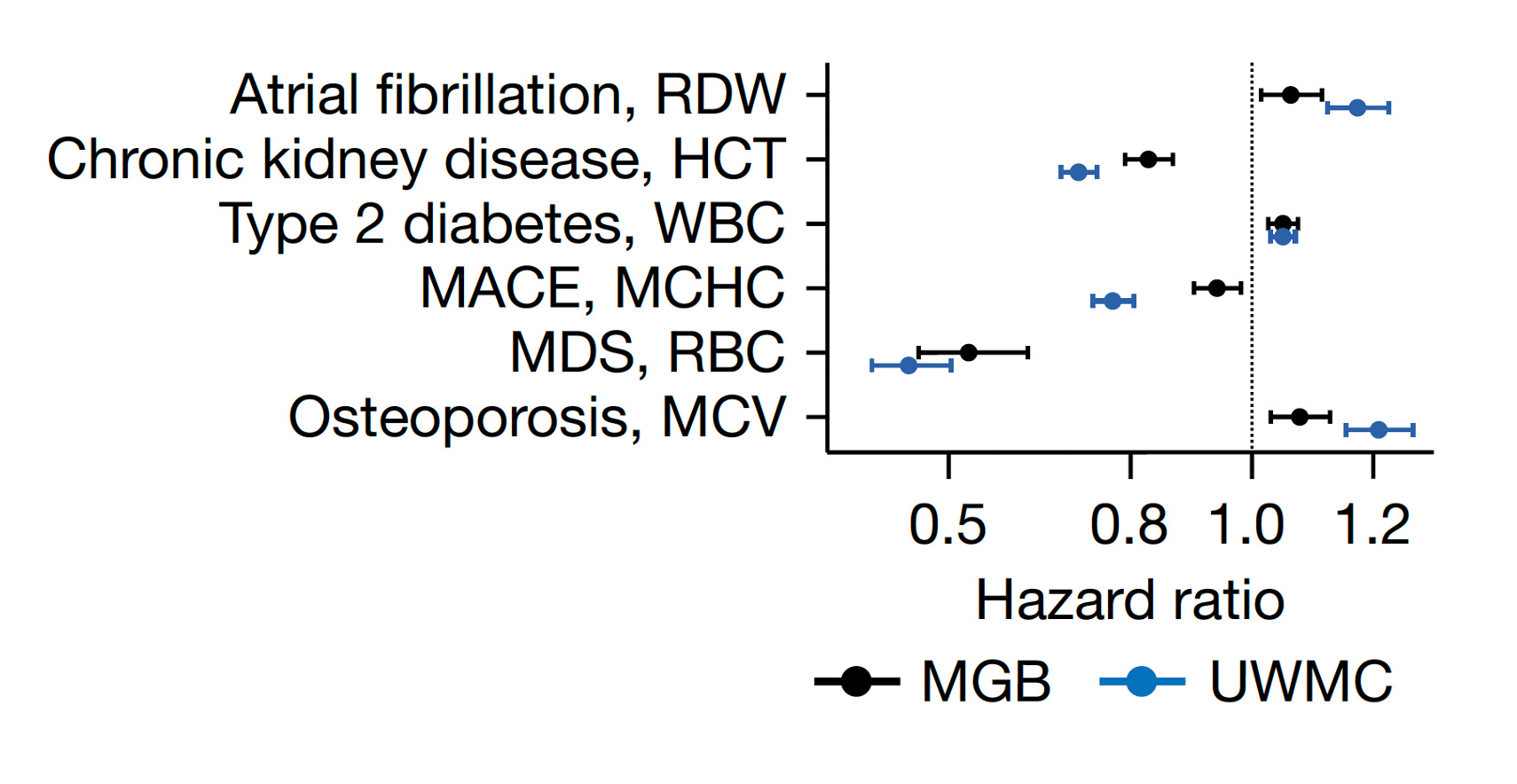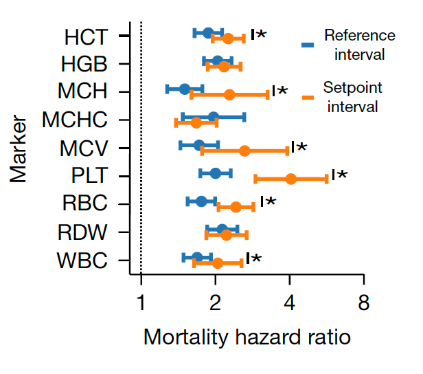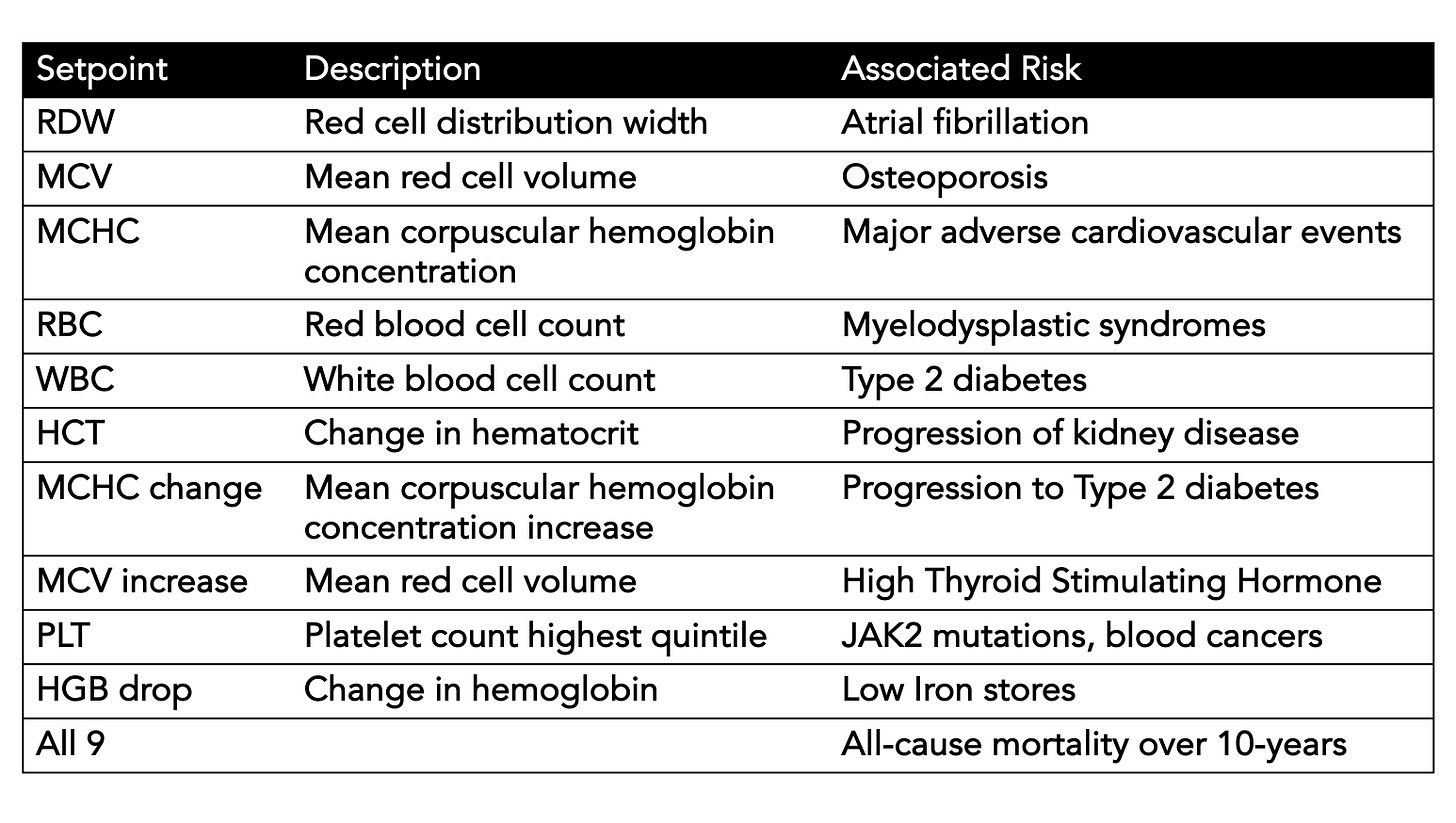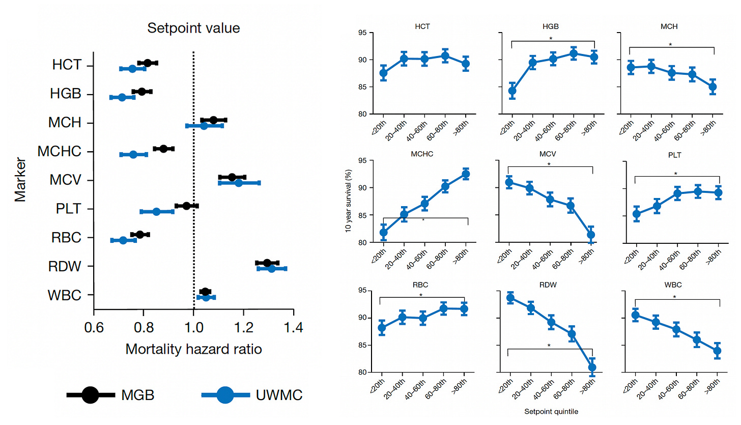 Beyond conveying risk of all-cause mortality, many of the setpoints showed association with diseases, such as the red cell distribution width (RDW) and atrial fibrillation, hematocrit (HCT) and chronic kidney disease, the white blood cell count (WBC) and Type 2 diabetes, the mean corpuscular hemoglobin concentration (MCHC) and major adverse cardiovascular events, the red blood dell count (RBC) and myelodysplastic syndrome (MDS), and the mean corpuscular volume (MCV) and osteoporosis. Again there was consistency in direction and magnitude of hazard (up or down) for most of these associations between the 2 cohorts.