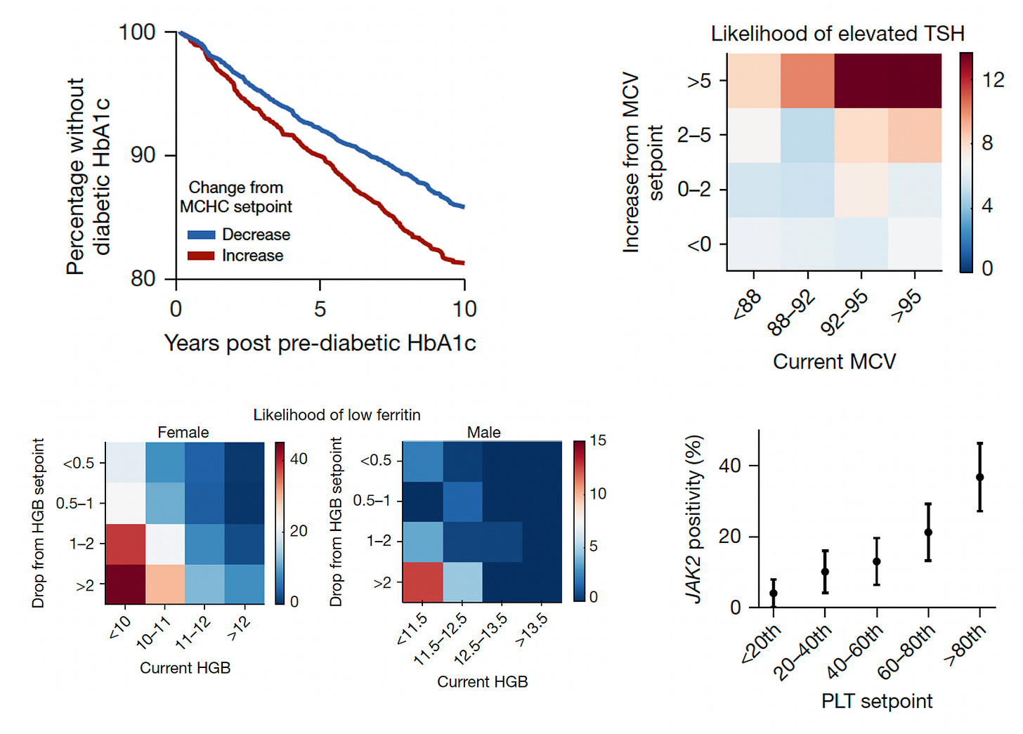 The next level of risk findings pertained to providing insights about many conditions that we don’t necessarily connect with CBC metrics (Figure below, 4 panels described sequentially). This enabled the ability to differentiate increased risk of progression to Type 2 diabetes in people as a function of MCHC setpoint, likelihood of hypothyroid status (elevated thyroid stimulating hormone (TSH) from the current MCV, low iron storage (ferritin) from the drop in hemoglobin, and even a mutation in Janus Kinase (JAK2) in people with high platelet setpoints (>9-fold higher rate of mutations, which are associated with several blood cancers.)