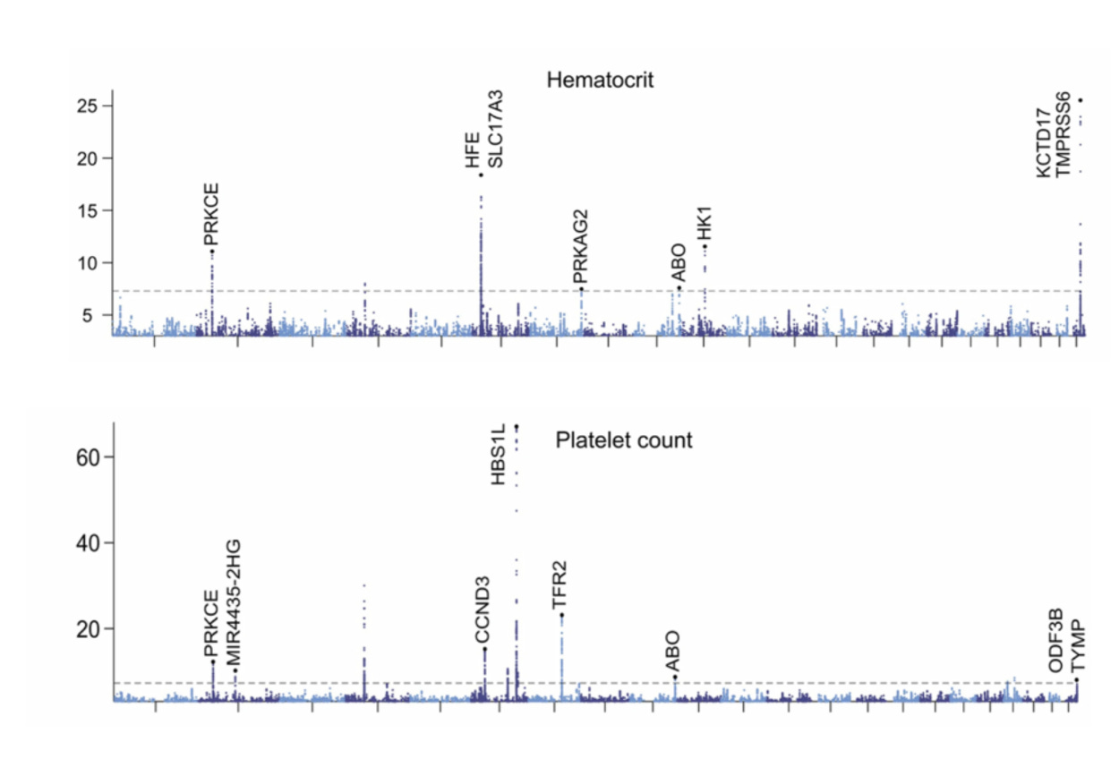 To understand the basis for patient-specific CBC metric setpoints, genome-wide associations studies were performed. As seen below for two results—hematocrit (HCT) and platelets (PLT)— Manhattan plots (dots above the dashed line support genome-wide significance) are representative of the others for demonstrating multiple genomic loci associated with the metrics among first-degree relatives, but this heritability only explained part of why there are such stable setpoints for each individual.